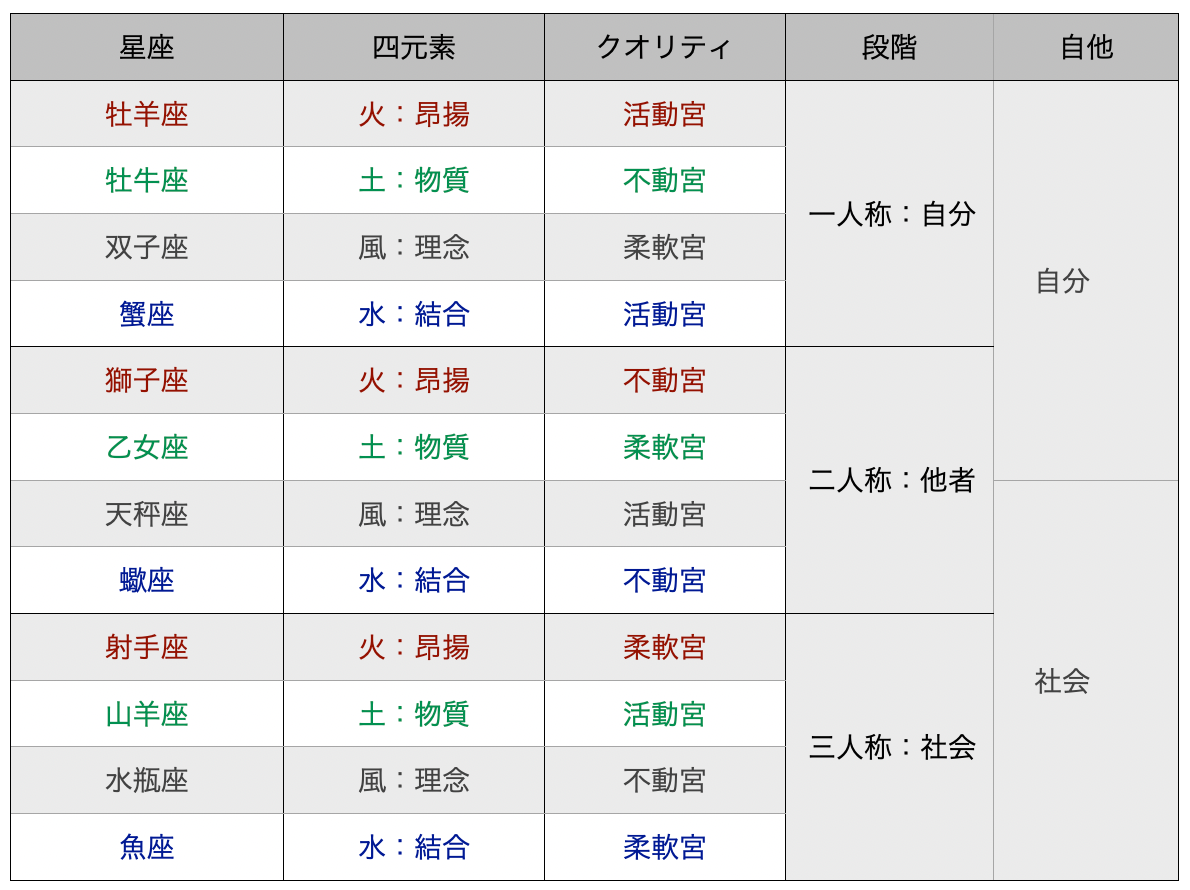 連載の各記事で解説している星座の意味合いや世界観は、星座のモチーフとなった神話から読み解くこともありますが、私はほとんどこの12星座内の段階(人の一生のうちどの段階に相当するか?)と、「元素 × 質」の組み合わせがどう表現されるか?という二つを中心に組み立てます。