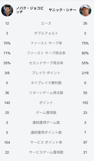 トータルポイントで見てもシナーのほうが明らかに点を取ってるんだけど、今日のジョコビッチは試合が巧すぎた。