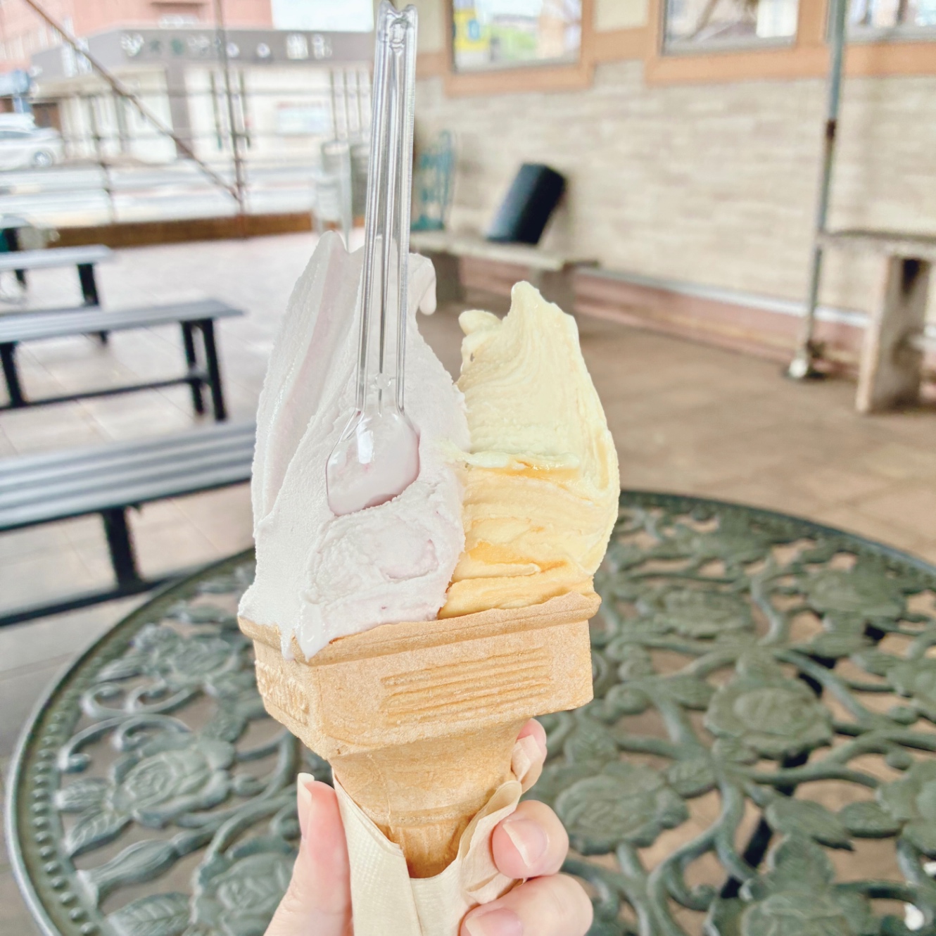 今日は朝から牧場のアイスを食べに出かけた。いちごミルクとキャラメルのダブル。