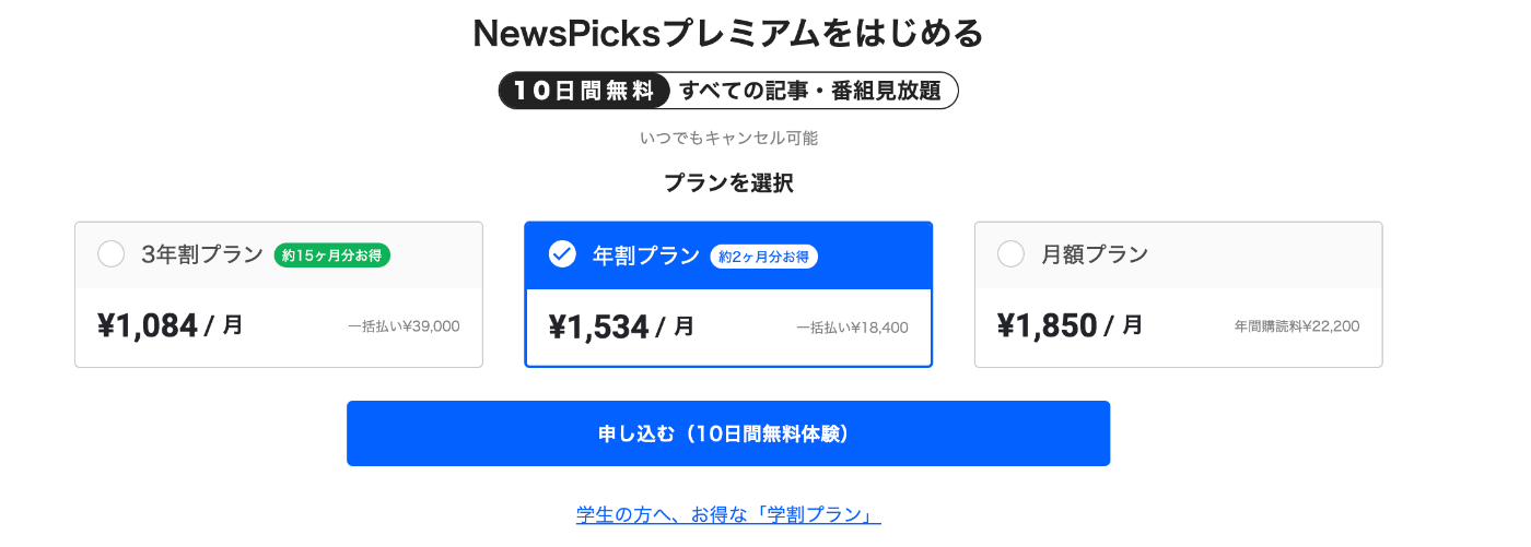 毎日新聞とスマニュー+のどちらを継続するかで迷っていたが、NewsPickプレミアムのトライアルも試すことにした。