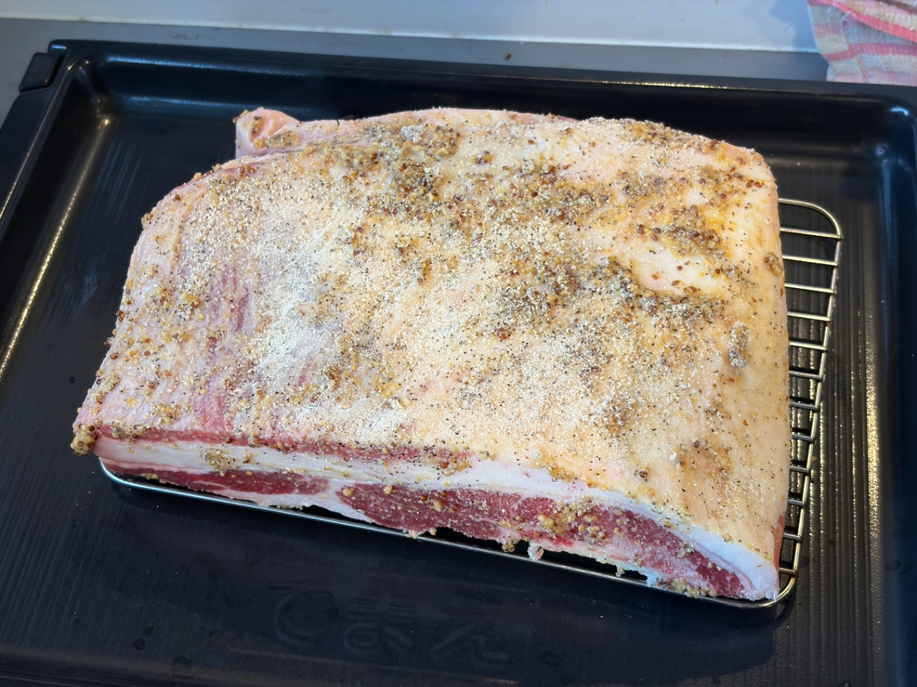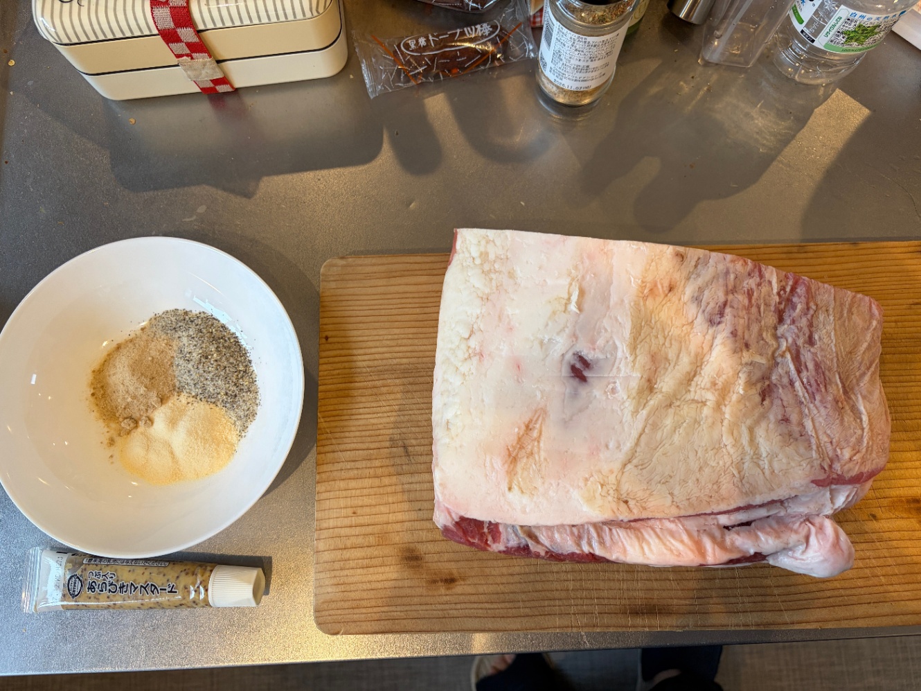 あとマスタード。これが、意外と日本のスーパーに売ってないです。イトーヨーカドーとかイオンとかの大規模スーパーに行きましょう。自分は手近なスーパーで粒入りマスタードしか売ってなかったので今回それを使いましたが、正直これはいまひとつでした。粒が邪魔。粒がないマスタードを大量にしっかり塗り塗りしたほうがいいです。