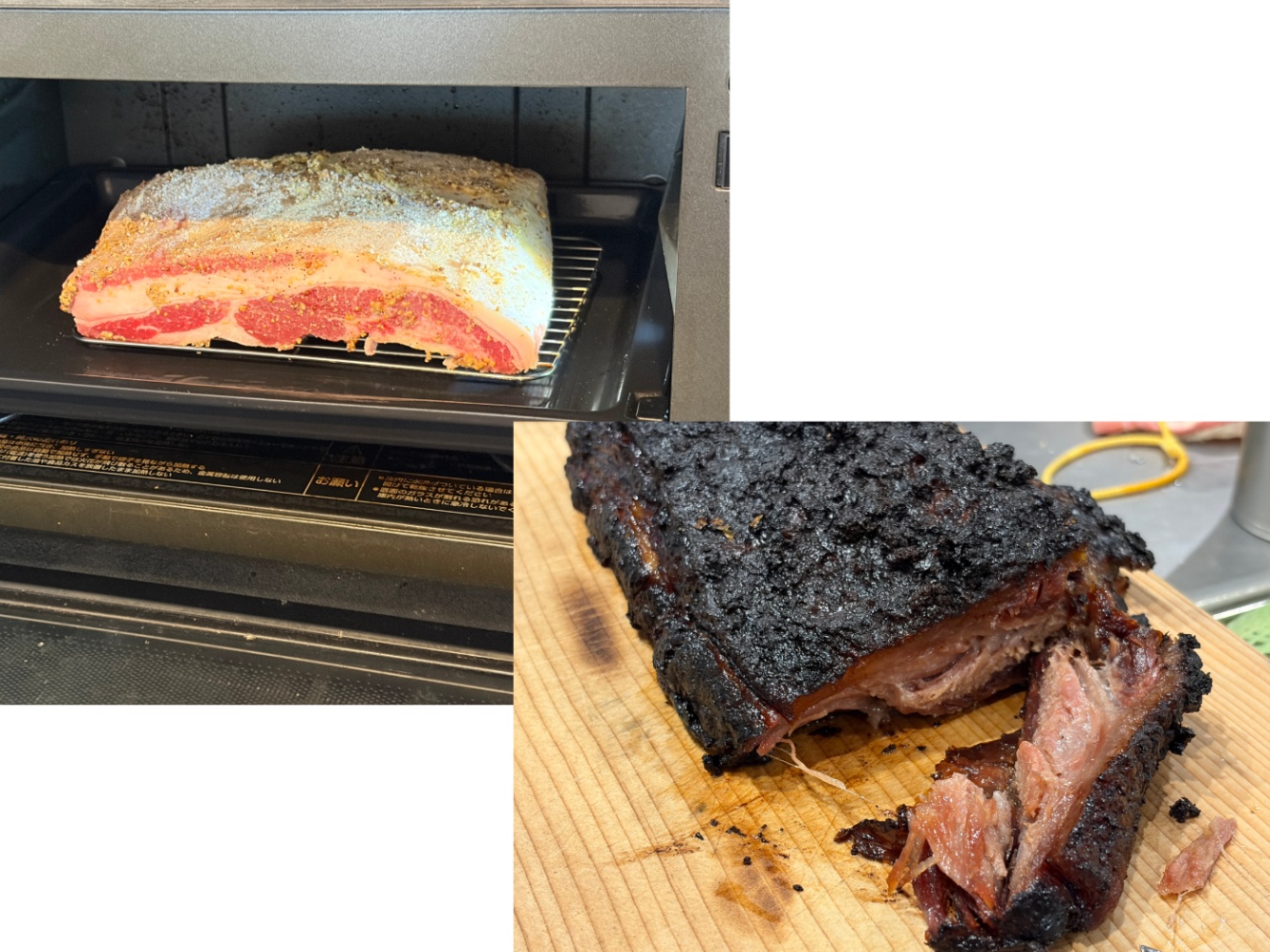 テキサスBBQは、Barkと呼ばれる黒い層(肉の脂分とスパイスとスモークの香りなどが固まり旨みが凝縮したレイヤー)と、長時間加熱されることで筋の部分がゼラチン化し柔らかくなった肉が渾然一体となった状態が特徴です。そこで、その状態に至るためのプロセスを