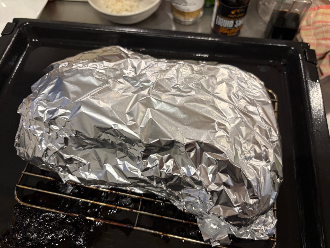 包んだ上でもう一度オーブンレンジにつっこみ、130度、6時間。あとはスモークリキッドの吹きつけもなくほっておきます。ただただ待つだけ。火の番とかしなくていいのは本当に楽ですね(ただ、家庭用オーブンは一度に「6時間」という設定ができなかったりするのでそういうときは2時間ごととかに時間を再設定する必要がありますが)
