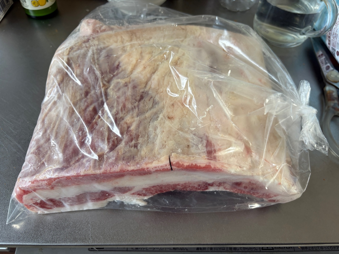 というわけでつくってみます。元のnoteでは和牛ランプを使用していましたが、今回は牛バラ肉の塊を使用。近所に「バリッバリの肉の卸ではあるが、直接行って頼むと小売もしてくれる」素敵なお店があることに気がつきまして、そこで買ってきました。みなさんも探すと近所にそういうところがあるかも…?ちなみに2kg用意しました。