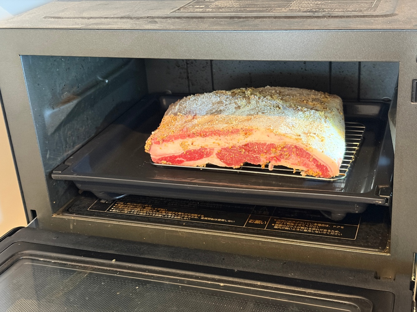 ここまでできたら、家庭用オーブンレンジに突っ込み、130度設定で6時間です。なお、家庭用オーブンレンジを使う場合は、オーブンレンジ、すなわち電子レンジも兼ねる機械なわけで。これをほぼ丸一日専有することになるので「電子レンジが1日使えなくなる」ことについてあらかじめ家族の理解を得ておきましょう。土日とかだと…地味に…昼頃のそのそ起きてきた子供が…冷凍食品を食べたい、と言い出すなどという事故が…