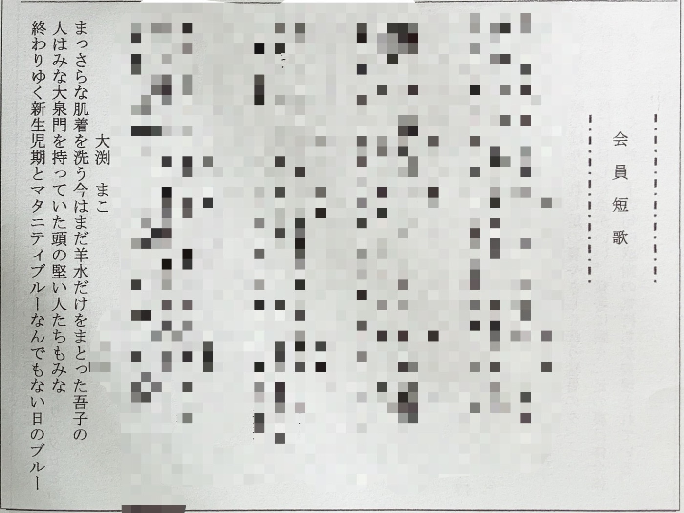 まっさらな肌着を洗う今はまだ羊水だけをまとった吾子の人はみな大泉門を持っていた頭の堅い人たちもみな終わりゆく新生児期とマタニティブルーなんでもない日のブルー(大渕まこ)大渕まこ短歌結社・歌林の会、熊谷短歌会に所属しています。