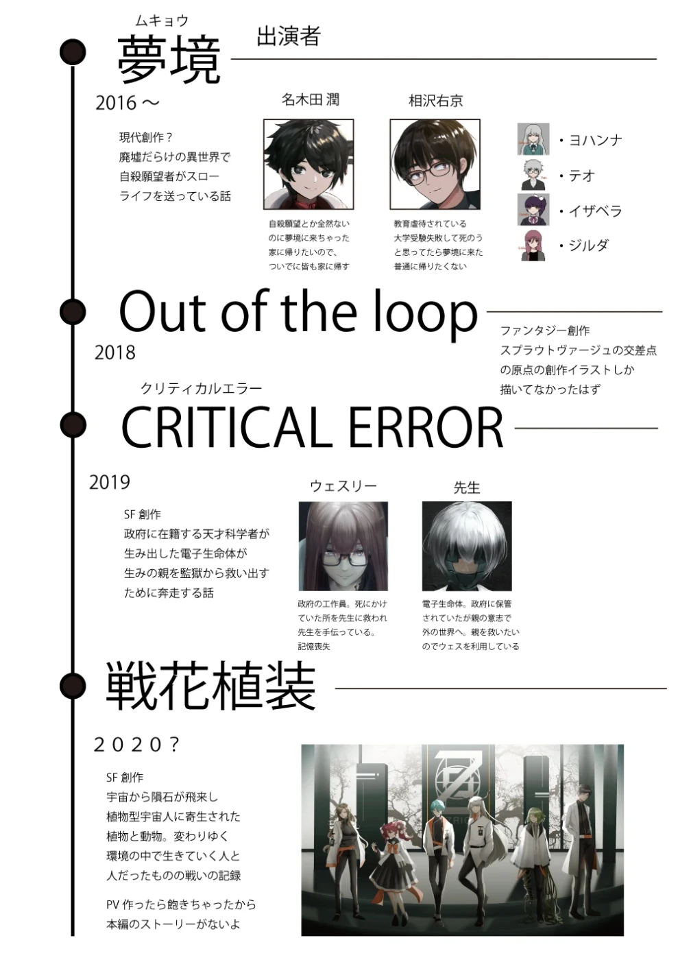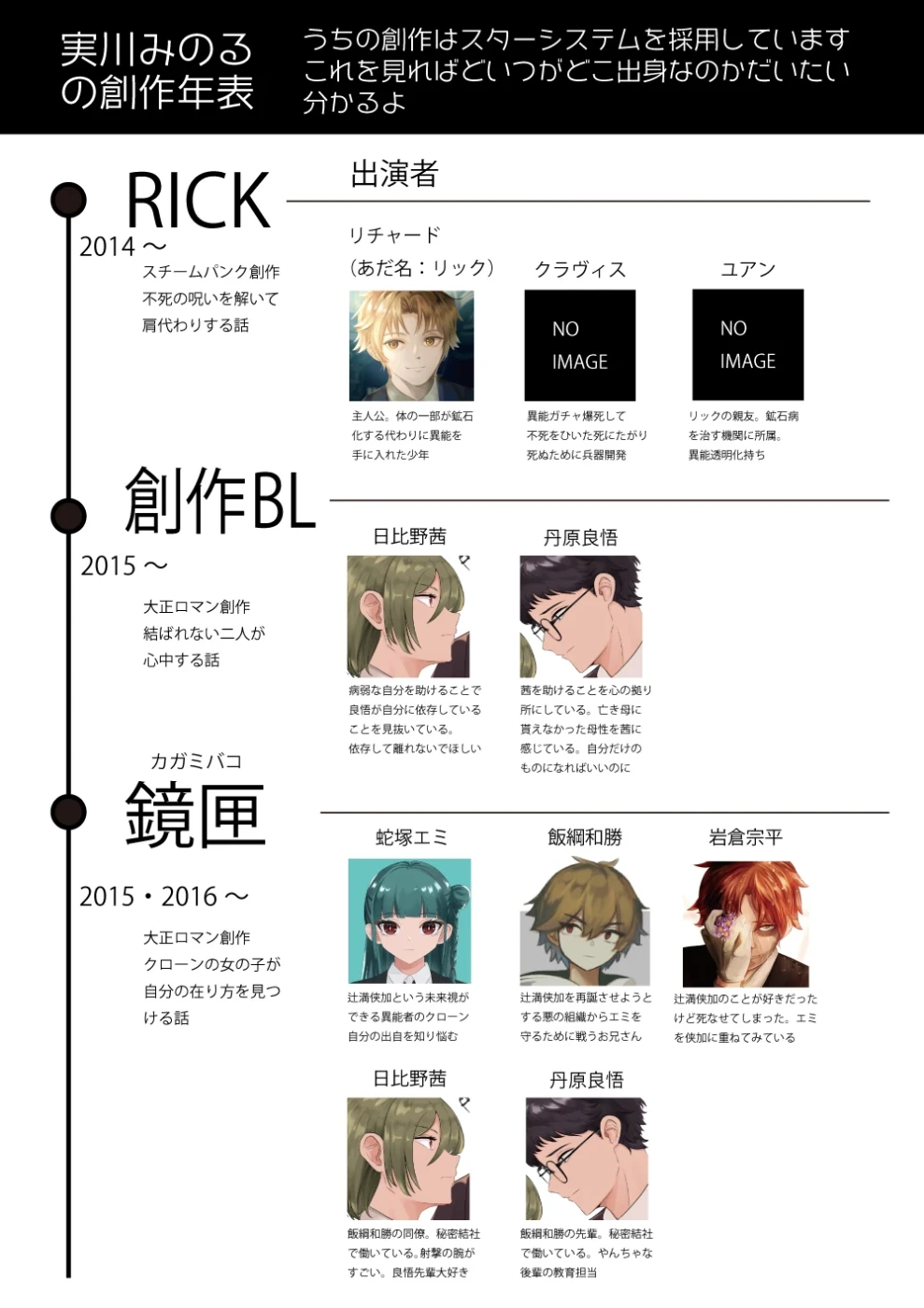 上記7創作が今のところみんながアクセスできる創作となっています。動かす気がない過去創作が「鏡匣」「CRITICAL ERROR」「戦花植装」「星の血族」とあるのですが、過去絵でちょっと恥ずかしいのと紹介するともうただでさえ長い記事がまだ長くなりそうなので、とりあえず2014年から2022年までの年表だけ置いておきます。