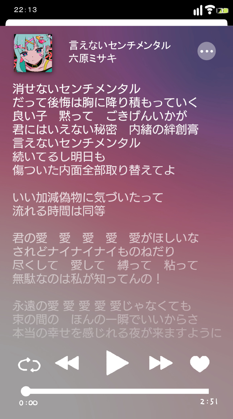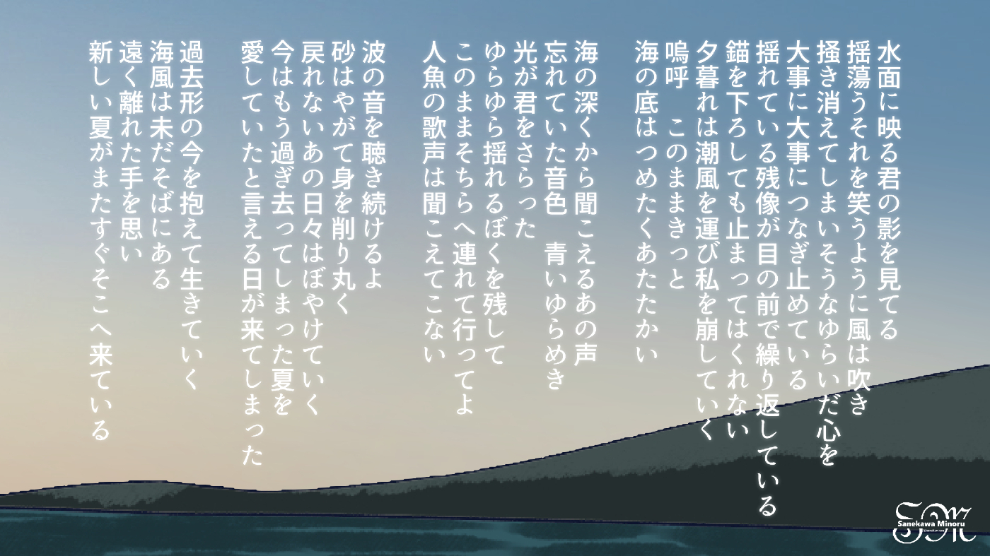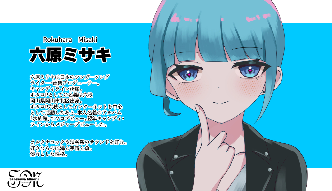 架空のシンガーソングライターの女の子、六原ミサキ、九条菜々子などの楽曲の無いMVや無い歌詞を作って遊んでいる創作です。特にストーリーがあるわけではなく、本当にただただ無い楽曲MVイラストを描いて遊んでいます。無い歌詞を作る過程で発生した詩などが下記リンクから読めます。