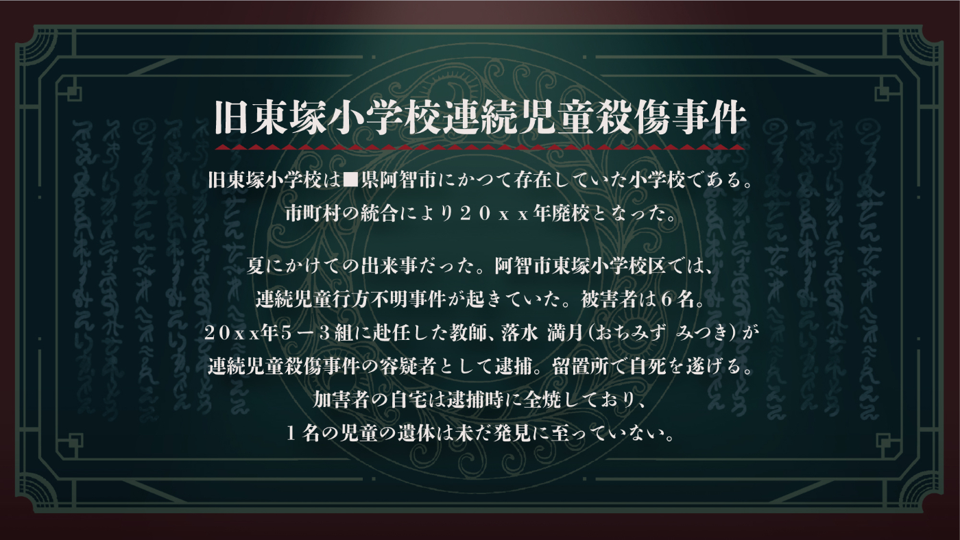 第3話旧東塚小学校では、廃校となり取り壊されてもう存在していない3人の母校である東塚小学校が雨の日に出現するという噂がエミの耳に入り、真相を確かめるべく雨の日に三人は異界と化した旧東塚小学校へやってくる話。旧東塚小学校が発生するのが何故かというと、旧東塚小学校連続児童殺傷事件の犯人である落水満月が残した呪物が原因なのですが、そこに怪異が発生し三人はそれに立ち向かうことになります。怪異を倒した際に次元の裂け目が現れて、エミはそこへアクセスすることが出来、小学5年生の時に居なくなってしまった飯綱和勝の居所を探し当てます。しかし彼は既に人間の形から逸脱した存在になってしまっており、エミと共に現実世界に帰ることは出来ないと伝えられます。エミは、自分の力の及ばなさで事件の際和勝を諦める事になってしまったことをずっと悔いていましたが、和勝にもう一度会い慰められることで、彼とお別れすることを受け入れます。長い長い彼を探すための怪異退治は幕を閉じ、エミ、潤、右京はそれぞれこれからの自分の人生と向き合うエンディングとなります。