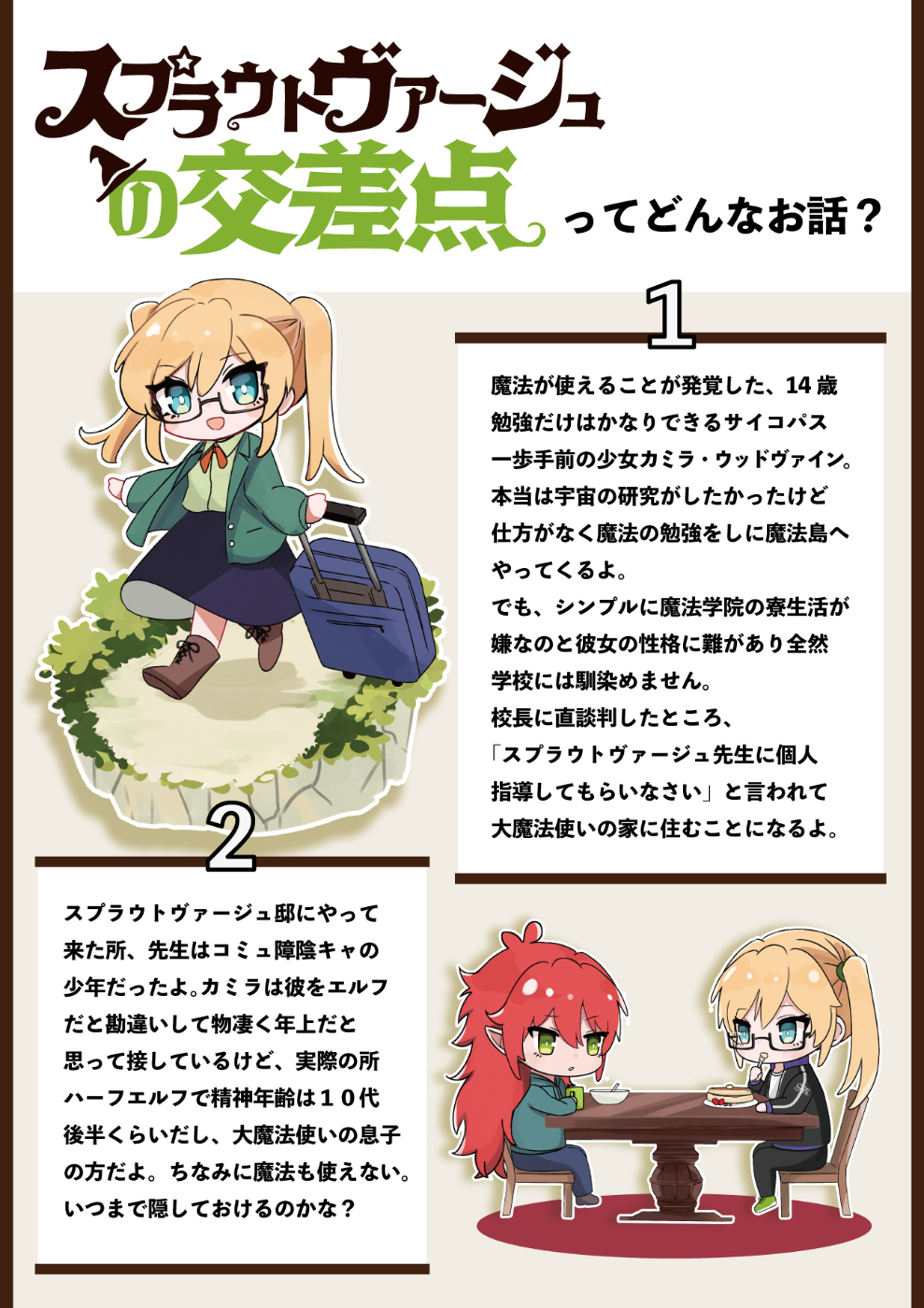 突然魔法の才能があると告げられた少女カミラは、地球に現れた異界との唯一の交流点「魔法島」で暮らすことになった。しかし全寮制の魔法学院には馴染めず、問題を起こして学校からは個人指導を勧められてしまう。勧められるまま共に暮らすことになった新しい魔法の先生は、エルフの同い年くらいの男の子で……?