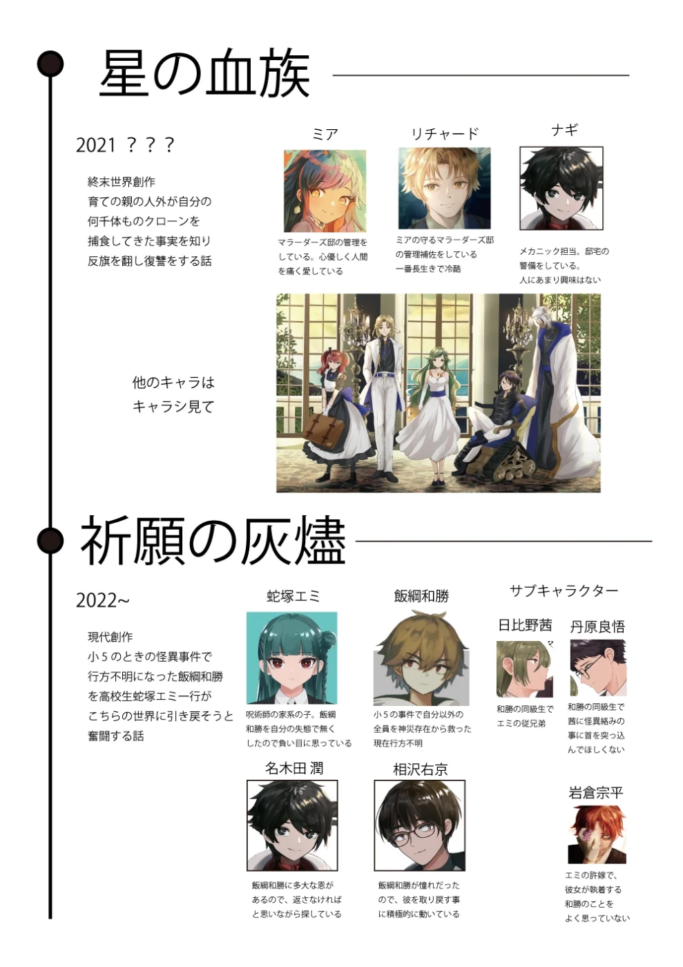 ここから本編小説がない創作になってきます。うちはスターシステムを採用しているので本編小説がある創作に登場する同キャラがいますね。2022年位からやってる創作で、プロットを3万字位書いて放置しています。