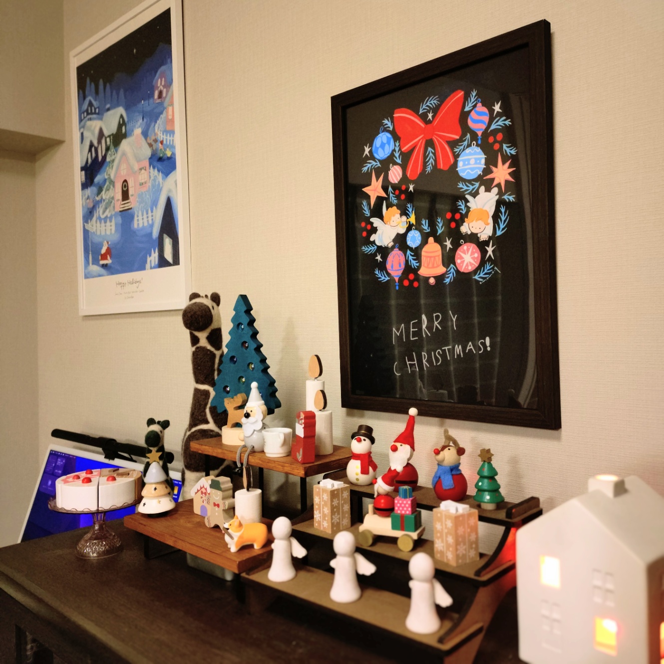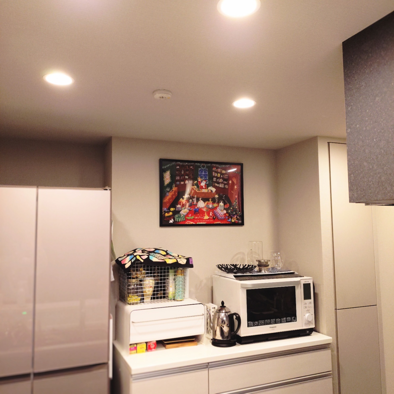 キッチンの絵もサンタのアトリエにチェンジ。おもちゃ工房のにぎやかな様子が楽しい。ここにB1(横)を飾ってみたいけど、壁面的にかなりギリギリなので踏み切れずにいるんだよね。B1の絵はみんな素敵だからなぁ。1枚くらい欲しいと思いつつ、あまり壁面スペースがないし、やはり絵の大きさに見合った距離感や空間が必要なので、ブレーキがかかる。