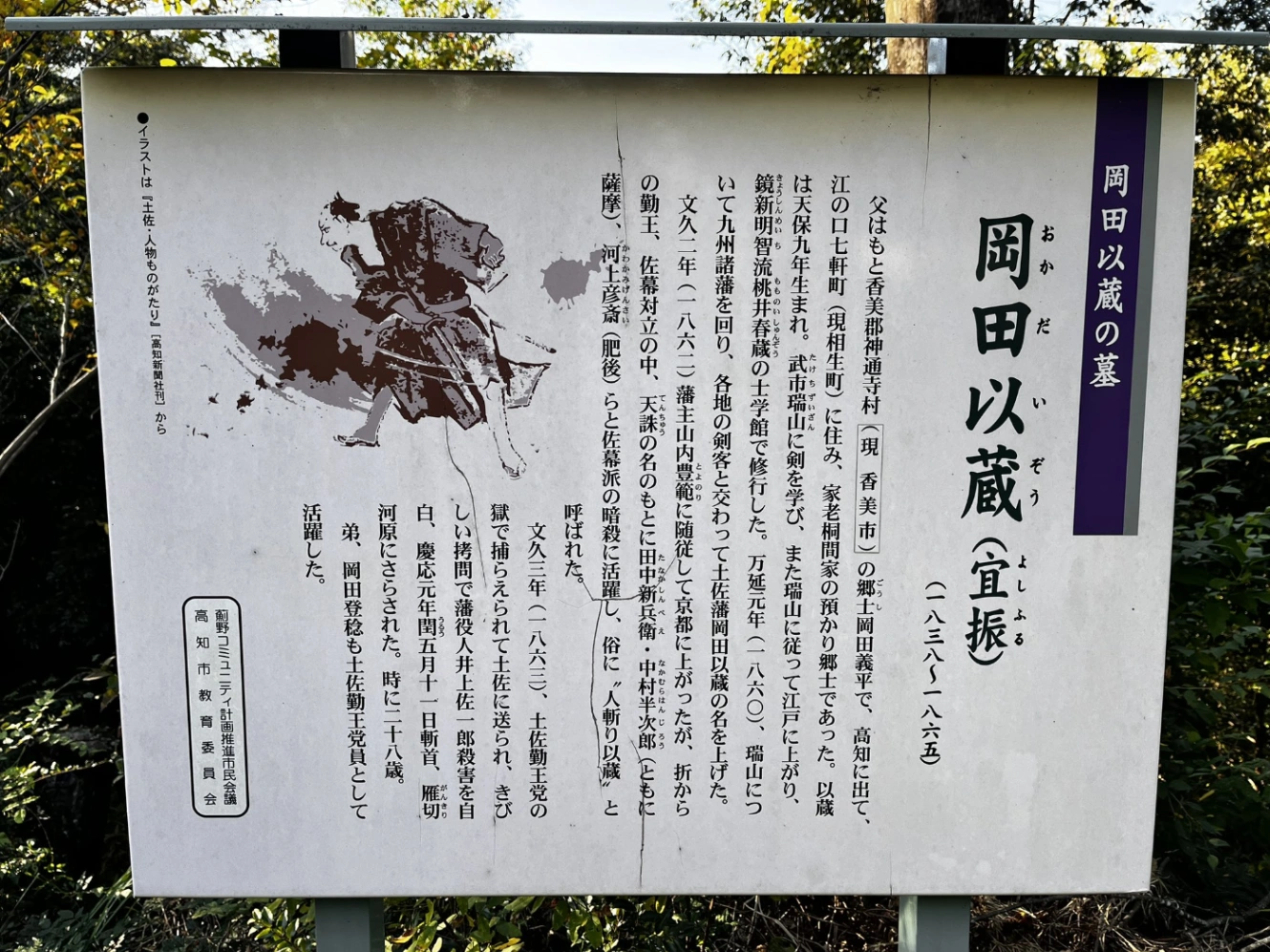 お昼少し前で、早速コラボルートから外れて、どうしても訪れたかった岡田以蔵の墓に向かうことにする。高知駅からバス一本(サニーマートあぞの店前)で近くまで行くことができる。ちょうどお昼を食べ逃していたので、目の前の恐らくチェーンのお寿司屋さんに入った。お寿司を食べながら、おいりょの以蔵さんは武市先生に毒入りの寿司を渡されて、死に損ねていたな…、と不謹慎なことを考えながら食べた。そんなことを考えていたからか、私も少しお腹を痛めた。何故?