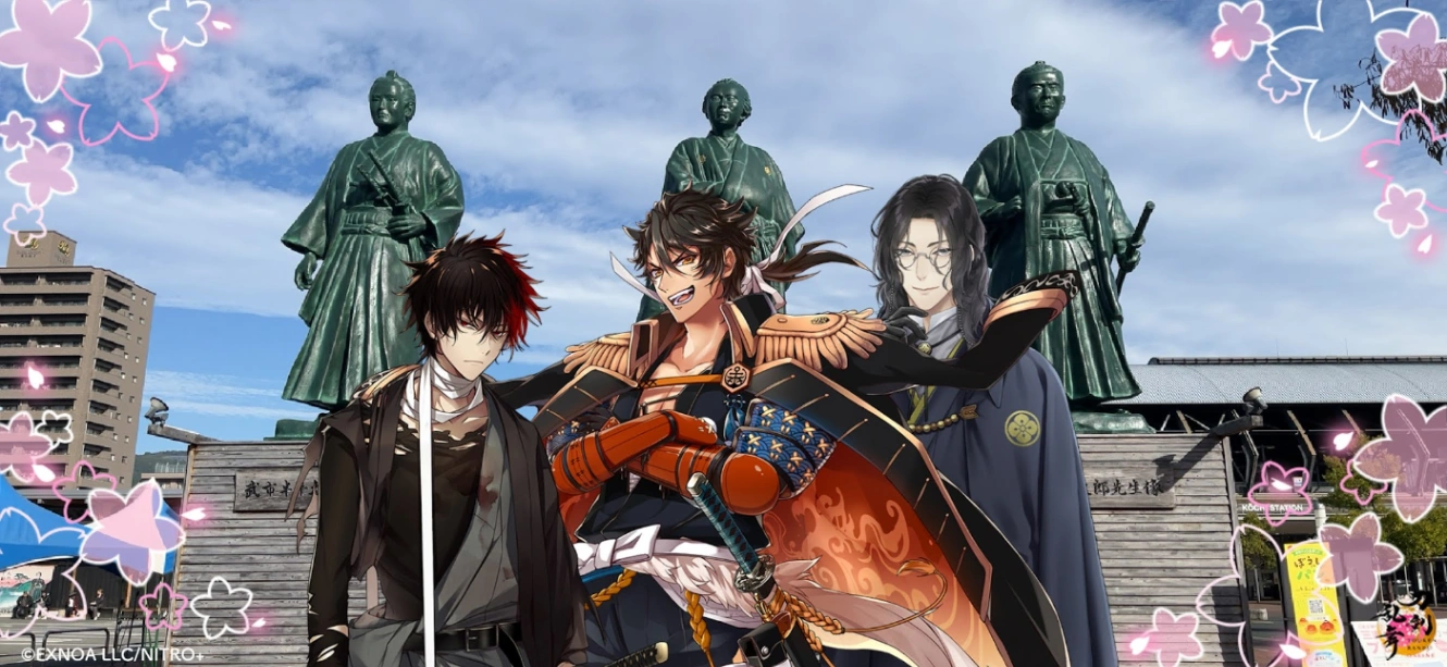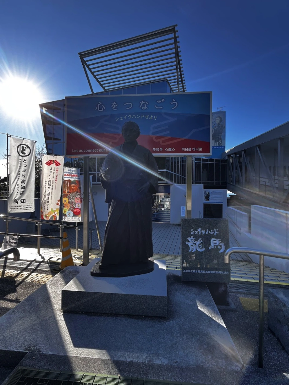 6時台のバスで3時間ほど揺られて、やっと念願の高知に着いた!到着したその時は実感が無くて、夢みたいだった。地方都市の駅はどこも雰囲気が似ている。漠然と福井や新潟、広島に降り立った時のことを思い出した。そのままふらふらと広場に出て、あまりに巨大な龍馬像たちをみて本当に高知に来たんだ〜、と実感がないままに御供機能(刀剣乱舞内にある、公式の写真撮影機能)で土佐三振りとの写真を撮った。ここで実感したのだが、銅像は坂本龍馬、武市半平太、そして中岡慎太郎の3体だった。岡田以蔵ではまあ、無いんだなと形容し難い顔になる。いつかツイートでみた、フィクションとしては取り上げられるが、罪人として処刑された人間の末路、みたいな一文がふと彷彿した。中岡慎太郎と肥前忠広には悪いけれど、そのチグハグな組み合わせのままに写真を撮った。(わたしは今年おーい!龍馬を完読しており、勿論中岡慎太郎も好きなキャラクターの1人になっていた)