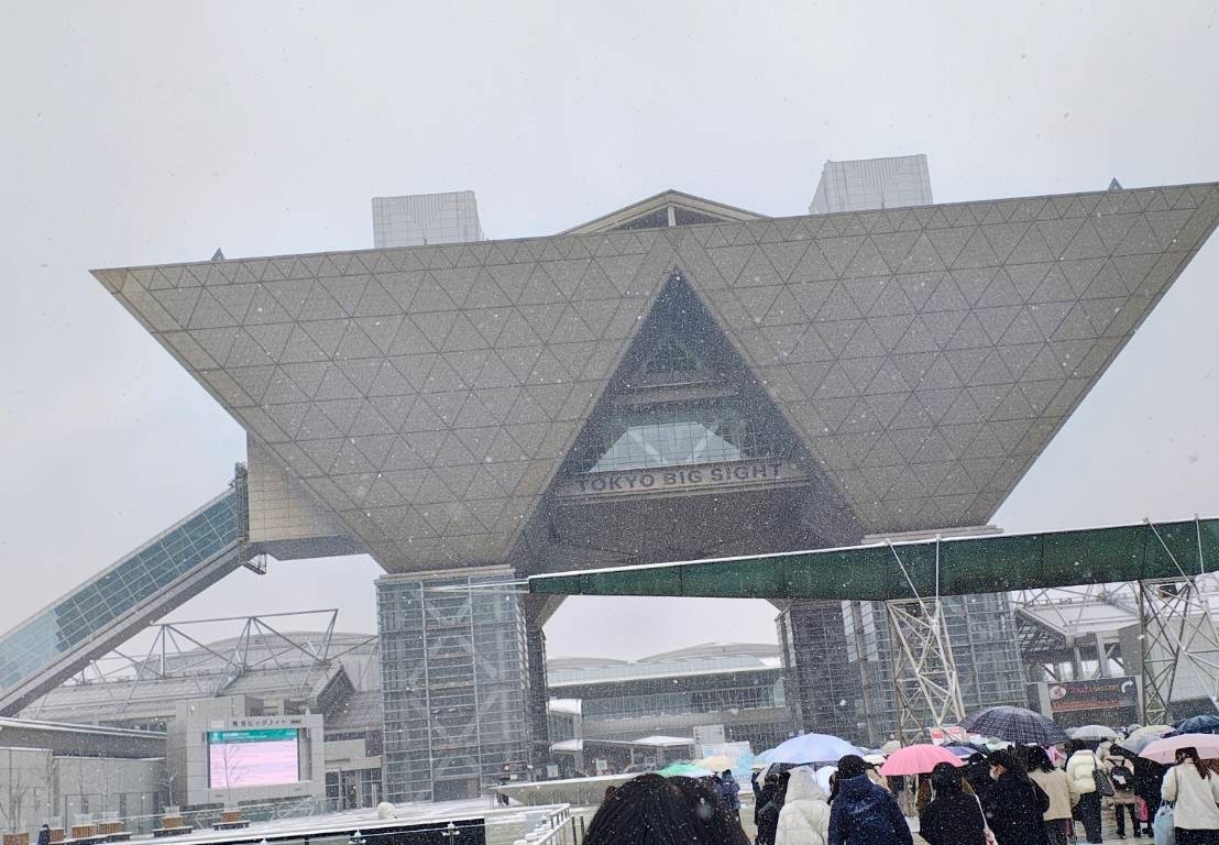 吹雪ビッグサイト。雪が積もってるビッグサイト初めて見た。無邪気に雪を堪能できないくらい地面がつるつるしていた。