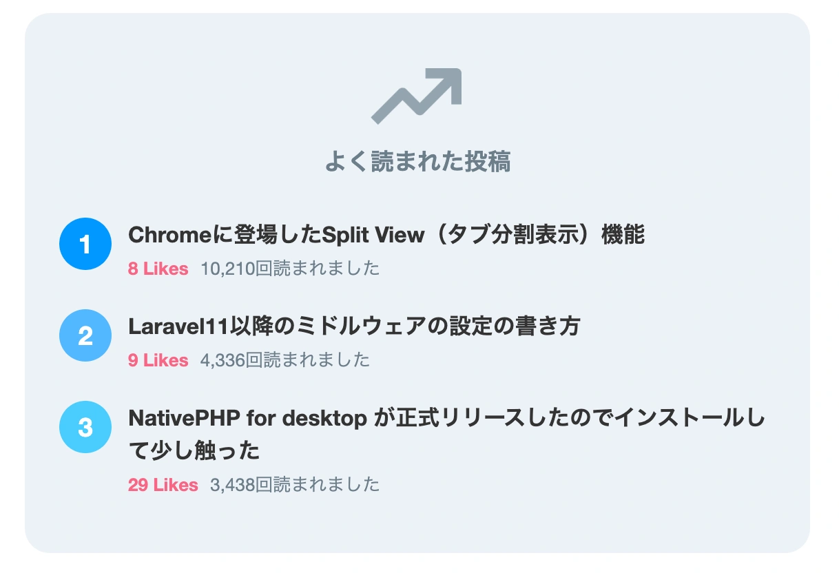 いいねの数が一番多かったのはNativePHP for desktop が正式リリースしたのでインストールして少し触ったの記事だった。