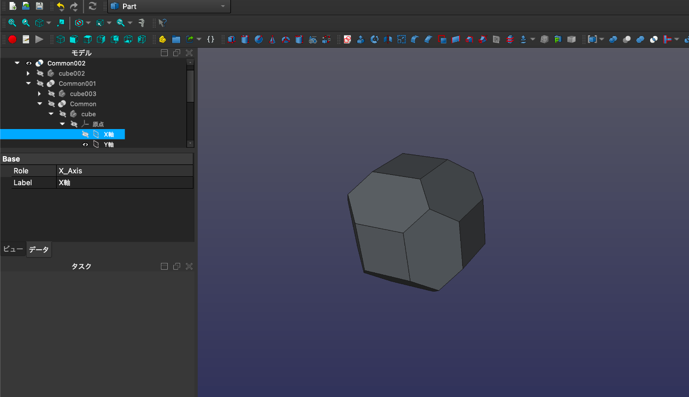 FreeCADの操作にいまだよく掴めないところがあるんだけど、切稜立方体をつくるにあたり、まず立方体をPart Designワークベンチでつくってから、Draftワークベンチに切り替えて立方体の一つの面の上にある四角形を作成する。それを平面に「格上げ」して、Partワークベンチに切り替えてから、Z軸周りに45度回転させた立方体を平面でSliceする。すると2つのパーツに分かれるので、大きいほうを残す(小さいほうは非表示にした)。これを立方体の残りの11本の辺に対しても、回転させたりして同様に繰り返す。