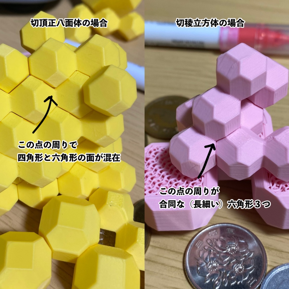 最初、ザ・体心体心立方格子という感じのある切頂八面体でもいいんじゃないかと思って作ってみたんだけど、これだと連結したピースを一つ上の層の斜めにつなげようとしたときに、ぴったりハマらないことに気付いた(もちろん切頂八面体は空間充填できる多面体なので普通に重ねることはできるのだけど、斜めにして重ねようとするとハマらない)。これが切稜立方体だと、多面体が3つ集まるところに120度回転の対称性があるのでぴったりハマる。こういことを言葉で説明してもよくわからないので、写真を撮った。