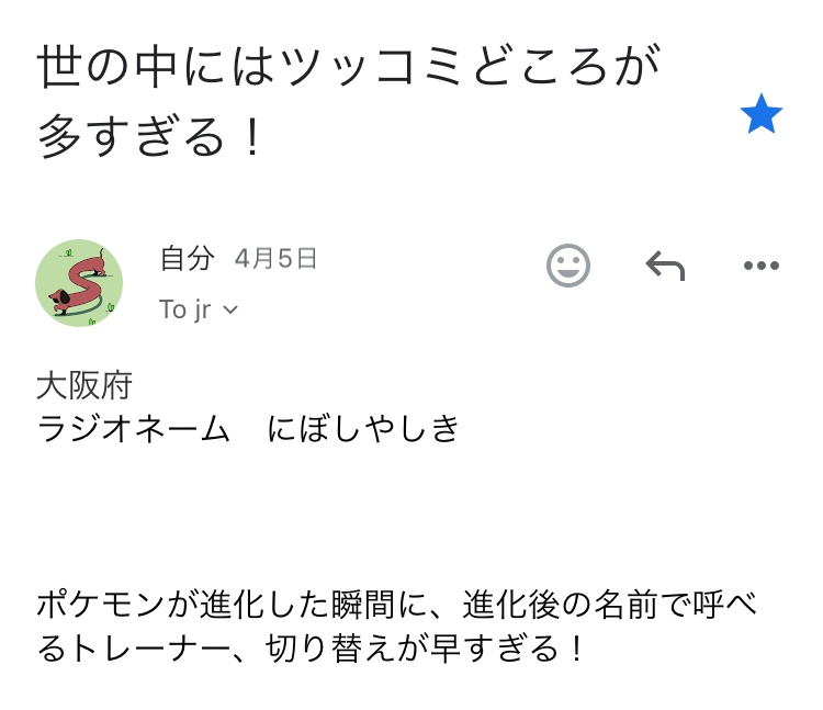 嬉しかったのは……ラジオネームが呼ばれた瞬間にゆうじろーさんが「おわー!?」と知ってる的なリアクションをしてくれたことと、コーナー後に「何回か聞いたことあるラジオネームの方出てきてますね!優秀!」と言ってくれたこと。これからも覚えてもらえるくらいには頑張りたいよ〜。