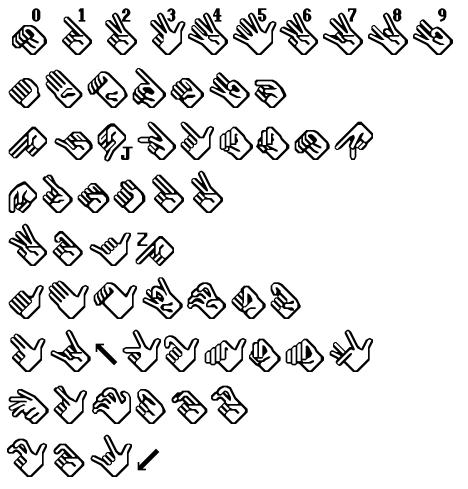 指文字の手形の表現に「ASL Font: Symbol Font For ASL」を使用してます