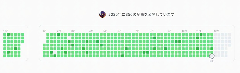 緑が日記書いた日、濃い緑が複数書いた日。書くの忘れた次の日は2回日記を描くマイルールなので、空白のあとは濃い緑のはず。