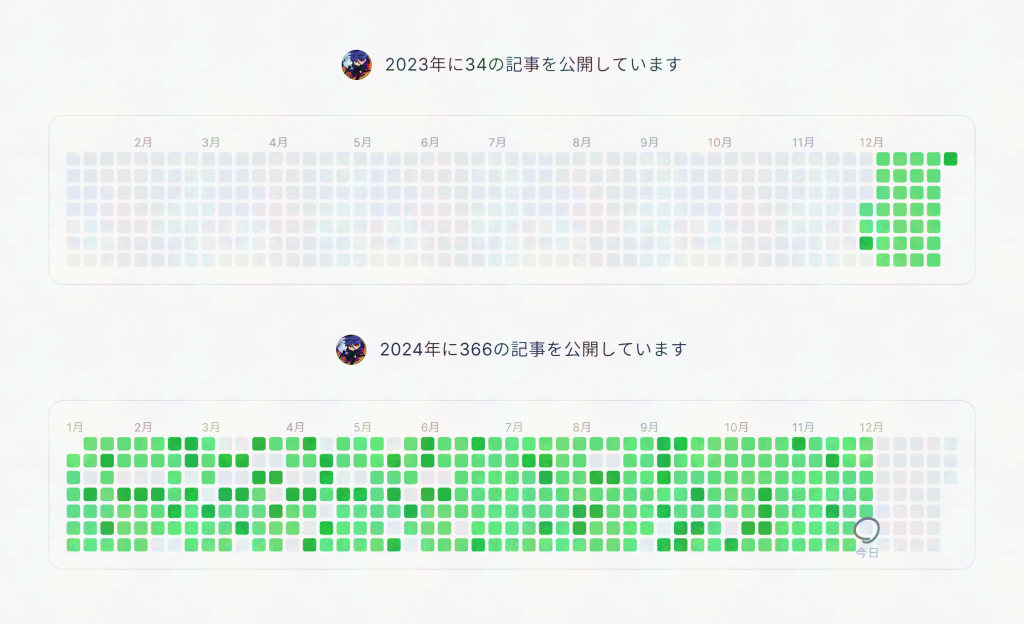 緑が日記書いた日、濃い緑が複数書いた日。書くの忘れた次の日は2回日記書くというルールなので、書き忘れた翌日は(ほぼ)ちゃんと濃くなってるえらい。最初の何回かはたぶんルール決めてなかったのでノーカンで(*´艸`*)