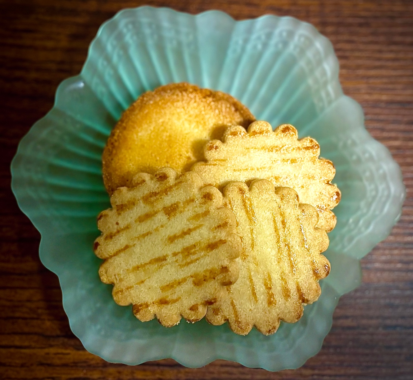 シンプルなガレットバタービスケット。奥の丸型が厚焼きで、手前の花形が薄焼き。