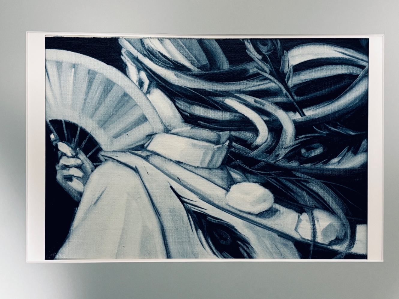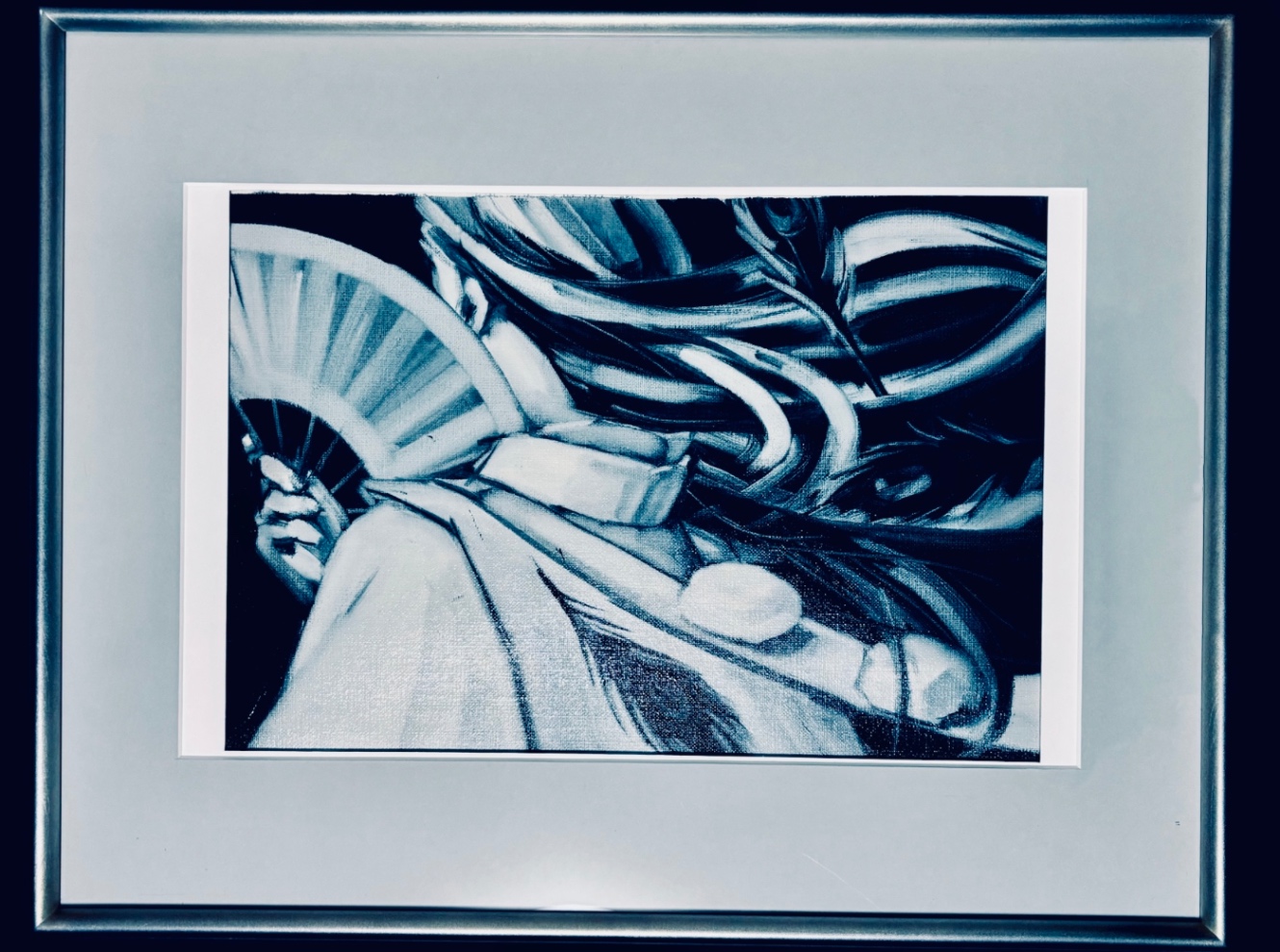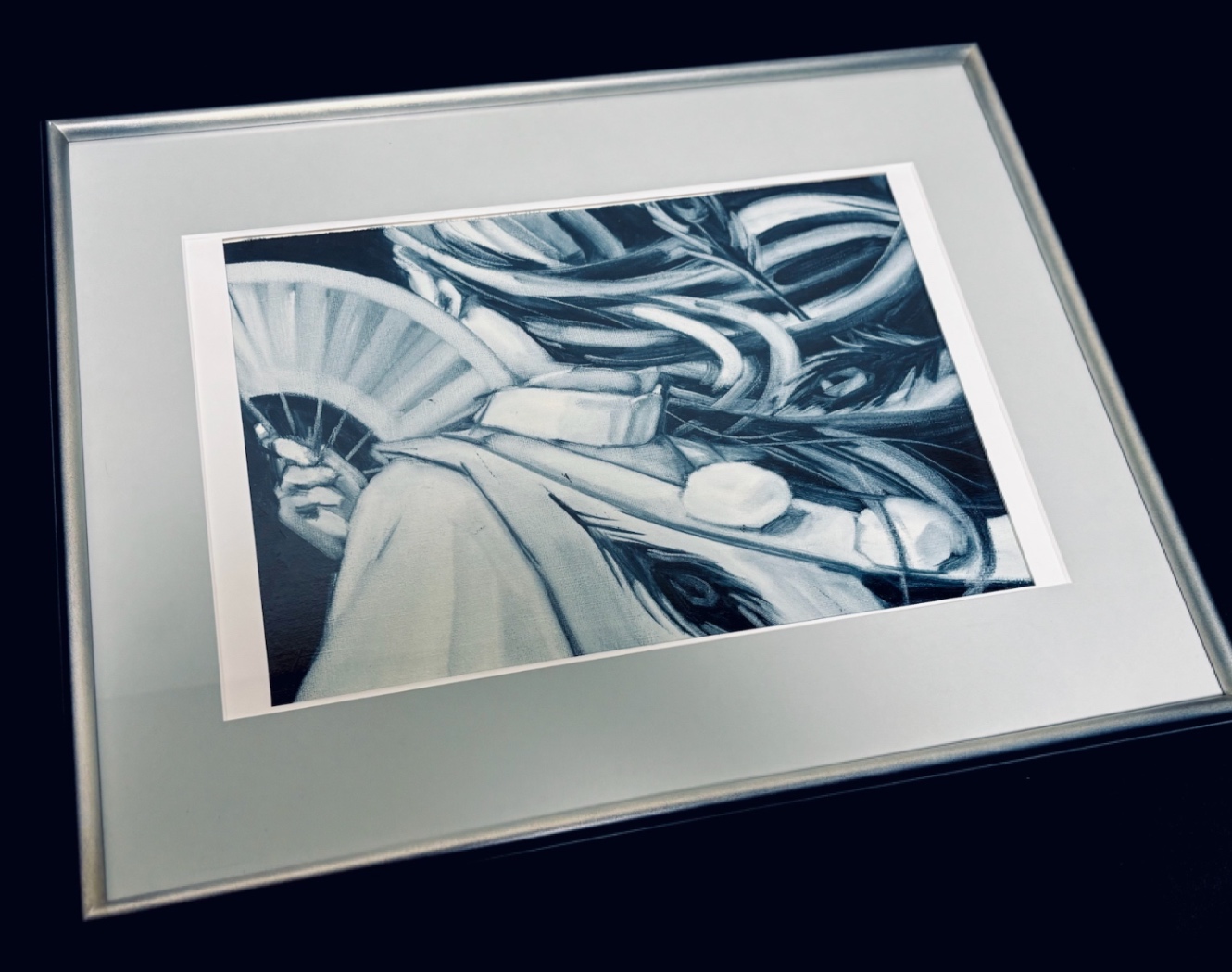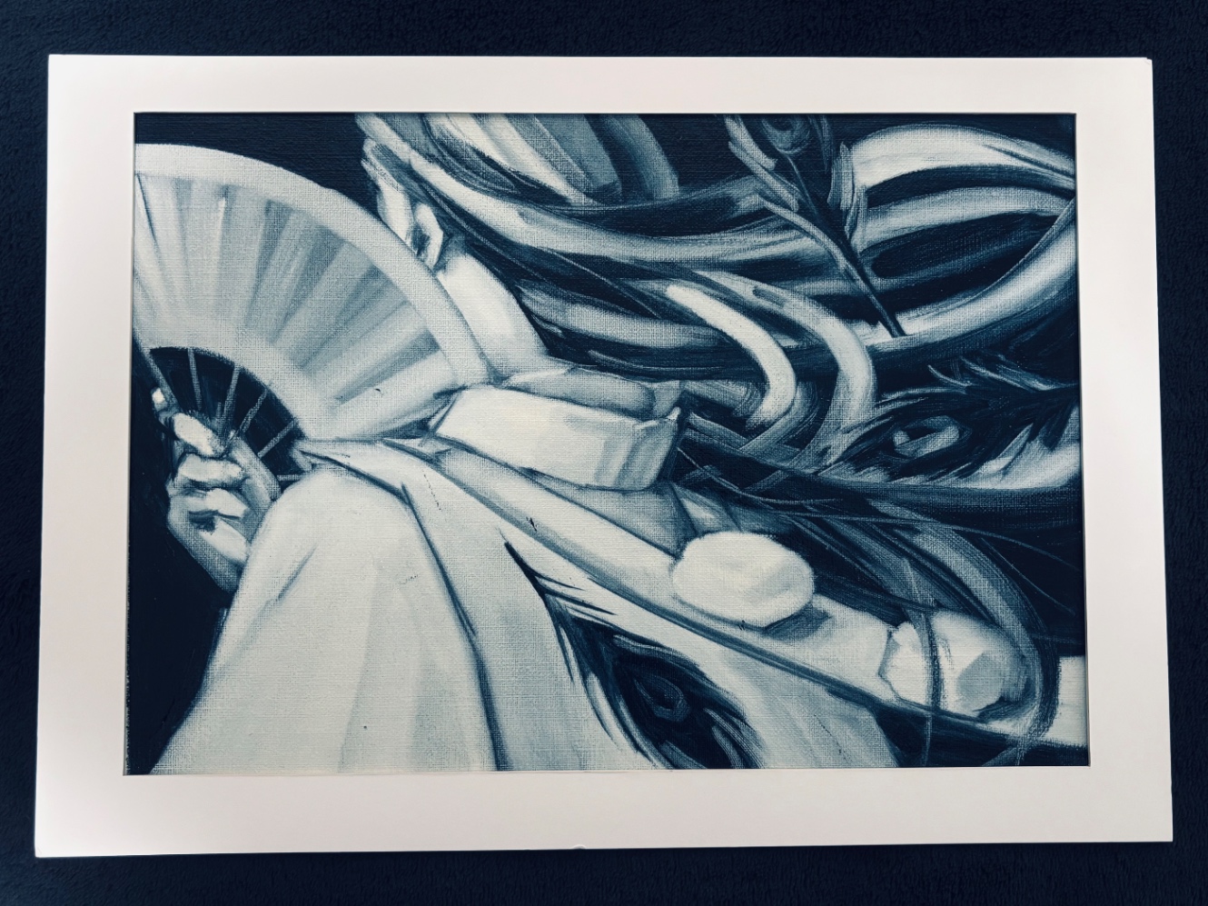 額縁とずばっとした藍色の作品が見事に調和している。大変な思いをしたが、なかなか納得のいく仕上がりになったのではないだろうか?
