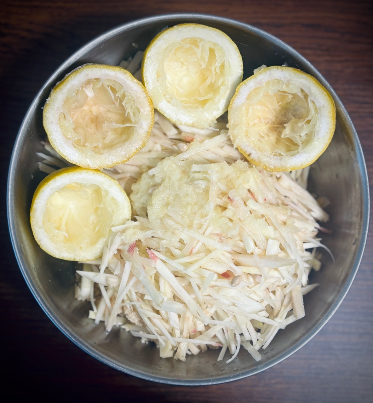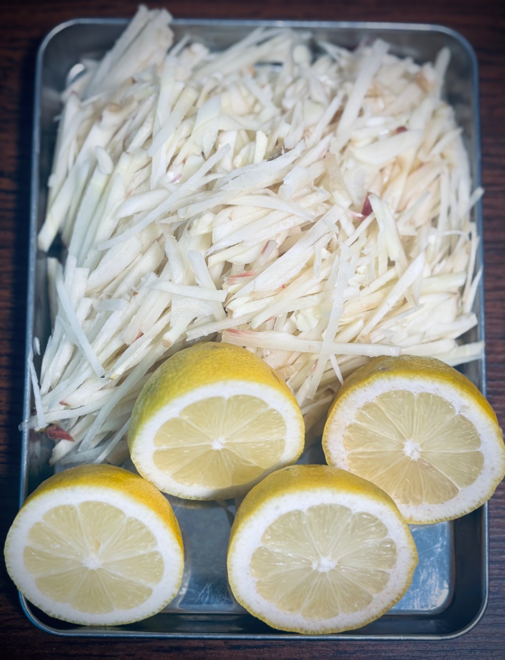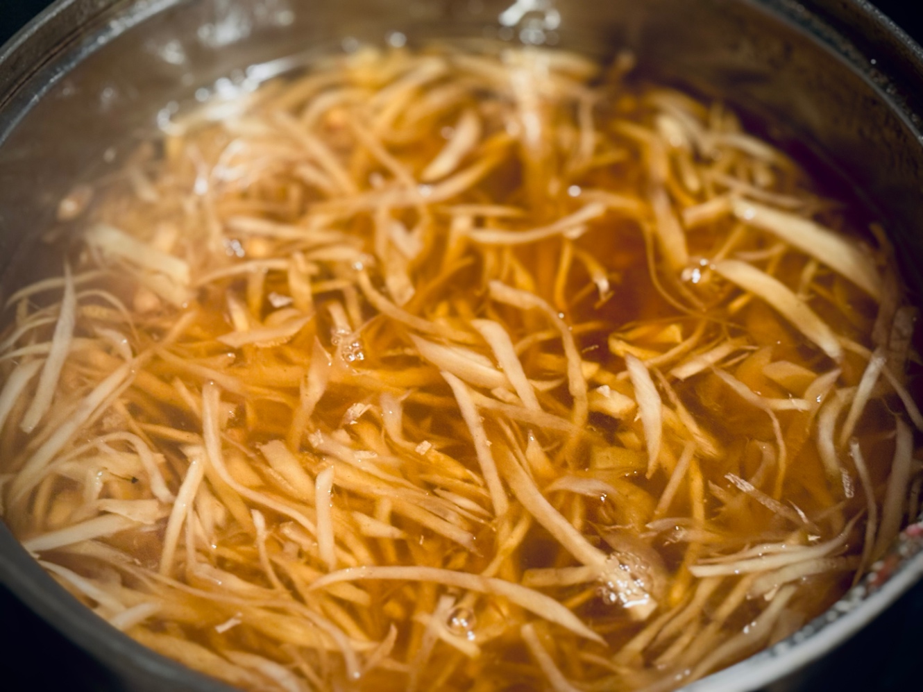 生姜は 断面積が多いほうが煮出すときに効率的かと思ってマッチ棒状にしてみたが、より強く風味を感じたいなら一部を磨りおろしに、逆に辛さを抑えたいときはスライスに留めることをお勧めする。