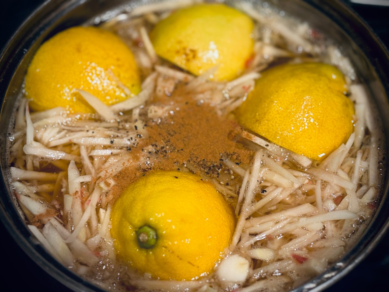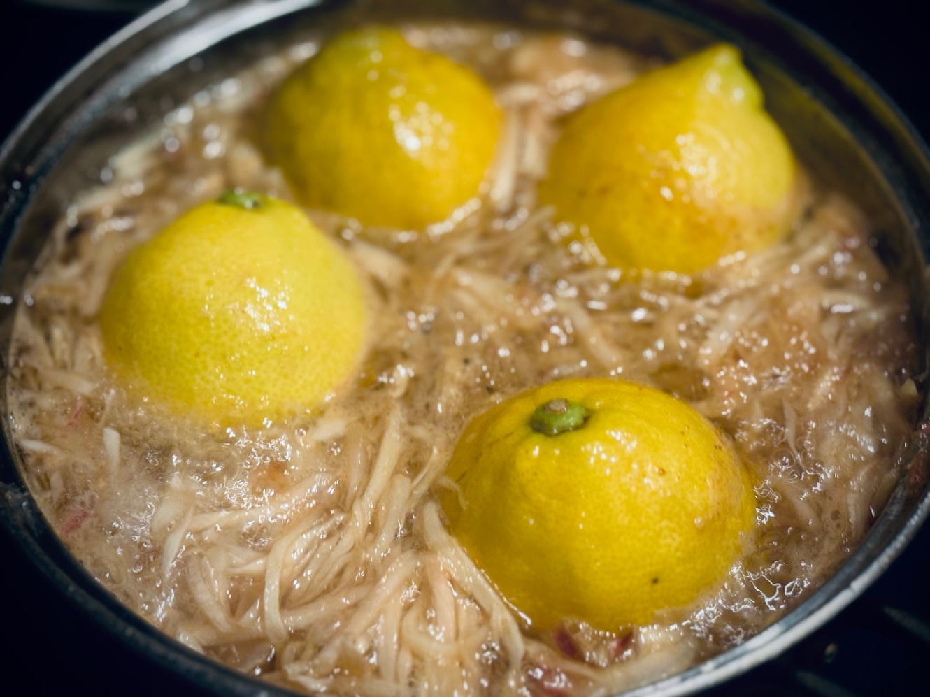 …水分が出てきて、こんな風にたけのこ入り中華スープとしか思えない見た目になるから、レモンの皮を回収。
