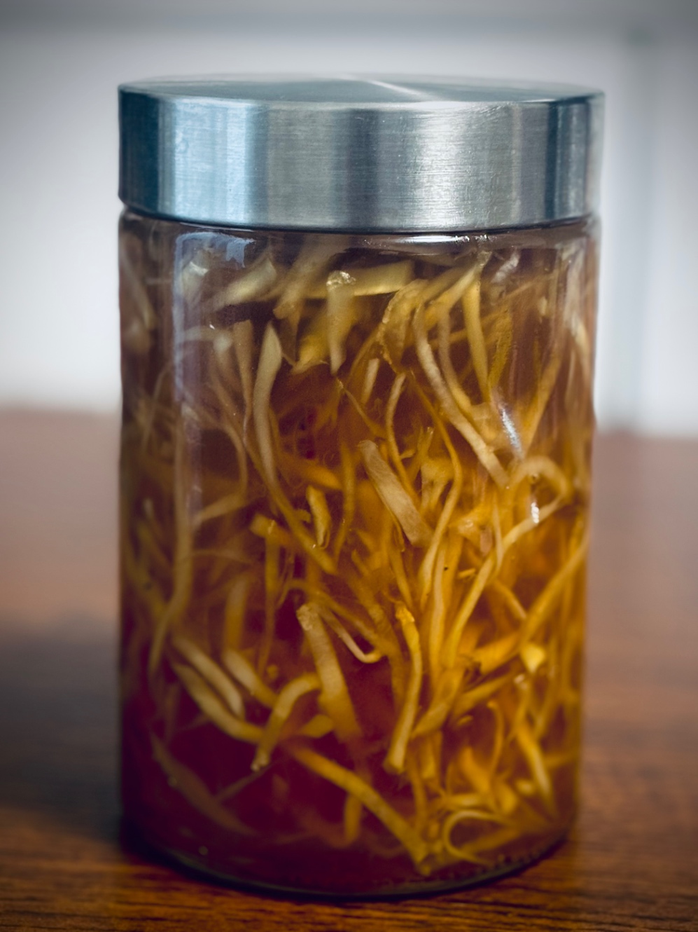 アルコールで殺菌したガラス瓶に入れると、なにか怪しげな民族秘伝の酒みたいなビジュアルになる。