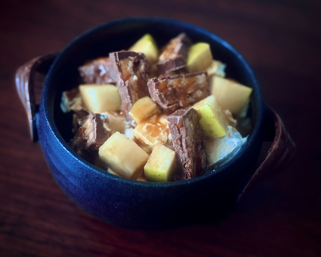 最後に取っておいたトッピング用の青リンゴとスニッカーズ片、さらに上からキャラメルソースをたらりと掛ければ、(完全に煮物としか思えない見た目の)「スニッカーズサラダ」が完成!