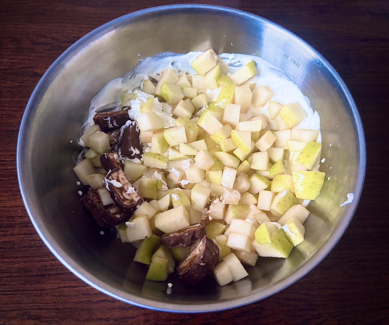 あとは、このボウルに 先ほど切った青リンゴとスニッカーズの8割ずつを投入する。残りは後で使う。摘まみ食いは2欠片までに抑えてくれ。