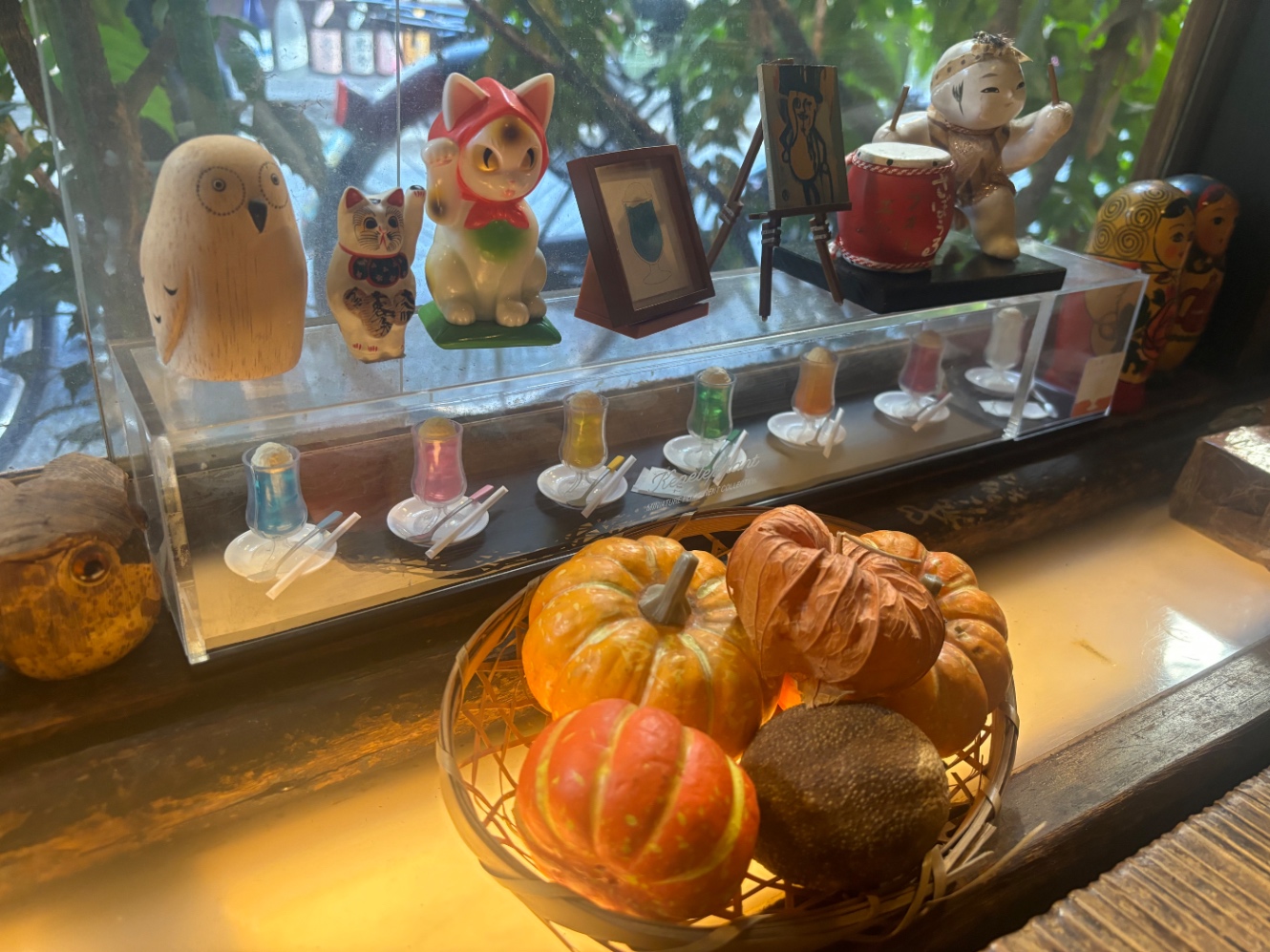 ここの名物は、何といっても7色のクリームソーダだ。窓際にはミニチュアのディスプレイが飾られている。