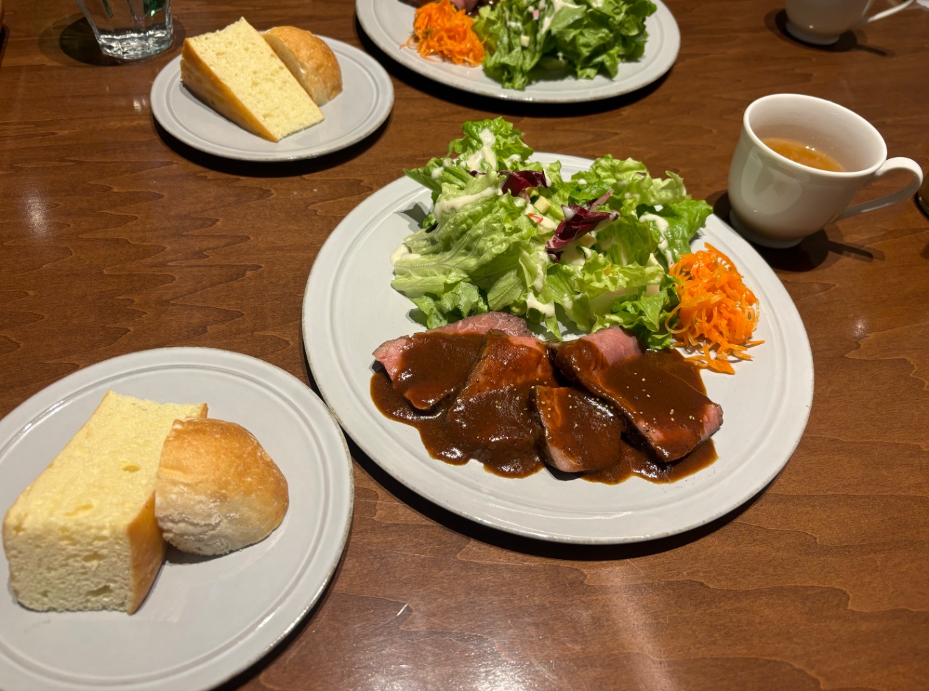 「薄い肉が食べたいですよね」という合意により、おれたちはランチのローストビーフプレートを注文。値段は忘れたが、1,400円くらいだったような気がする。スープとサラダ・パン・選べる飲み物が付いている。