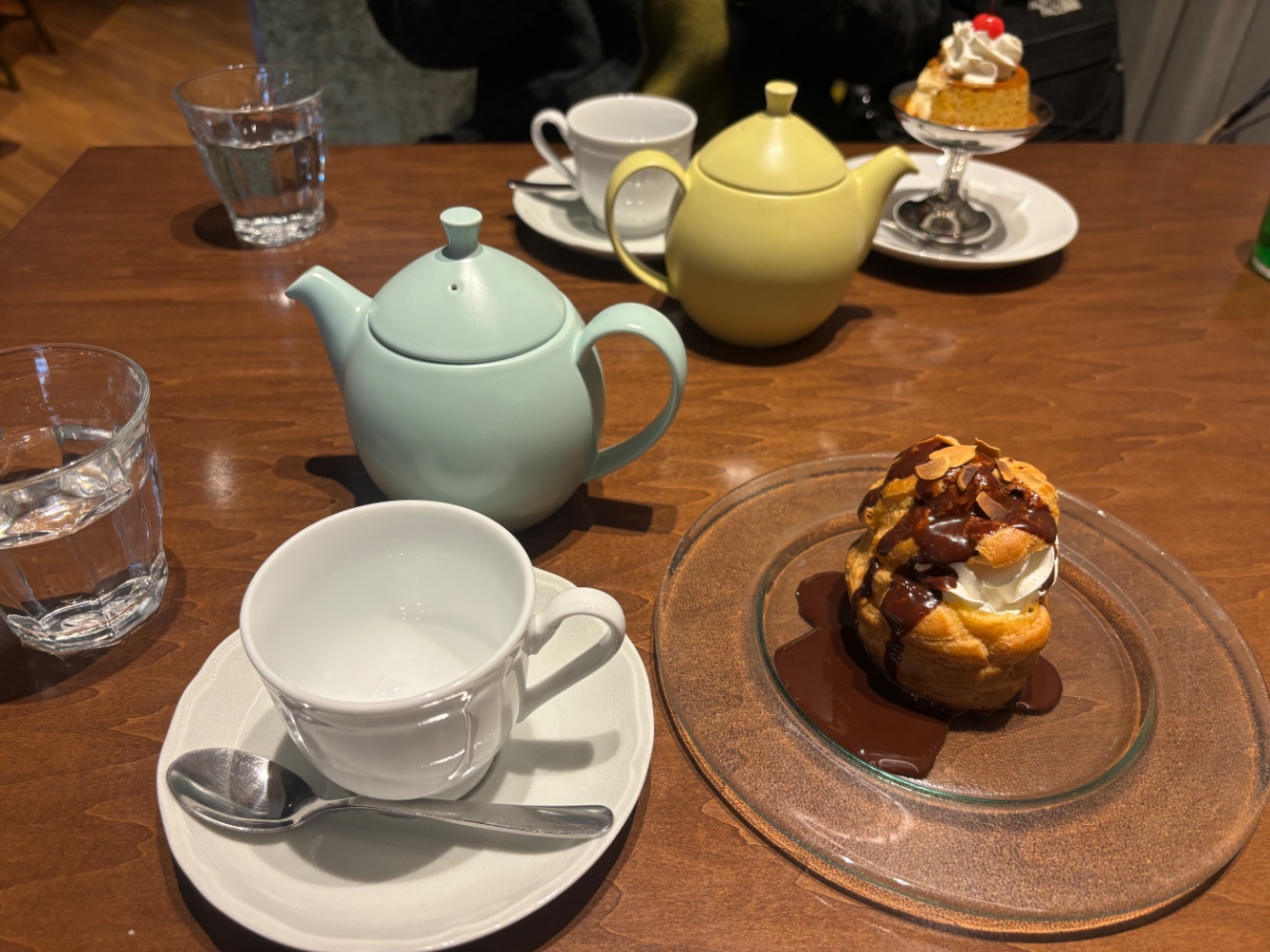 …ので、当然 印象的な件のシュークリーム (プロフィットロールというらしい) を注文。シュー生地の中にカスタードとホイップクリーム、チョコレートコーティングという英国風のアレンジ。
