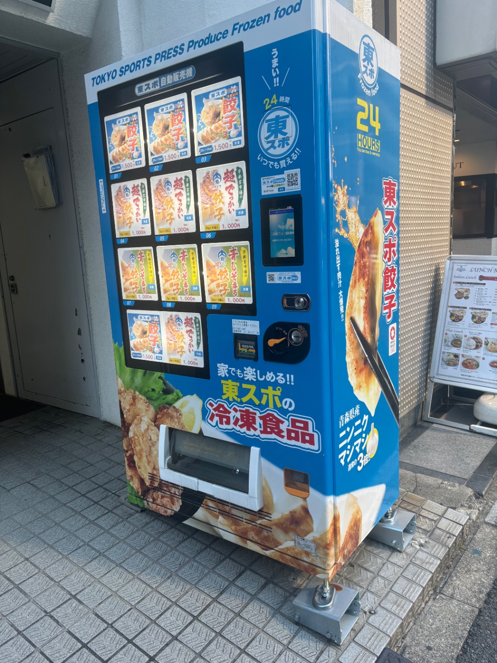 道端に設置された東スポ餃子 (詳細不明) の自販機に引っ掛かる二人。嘘みたいに愉快。