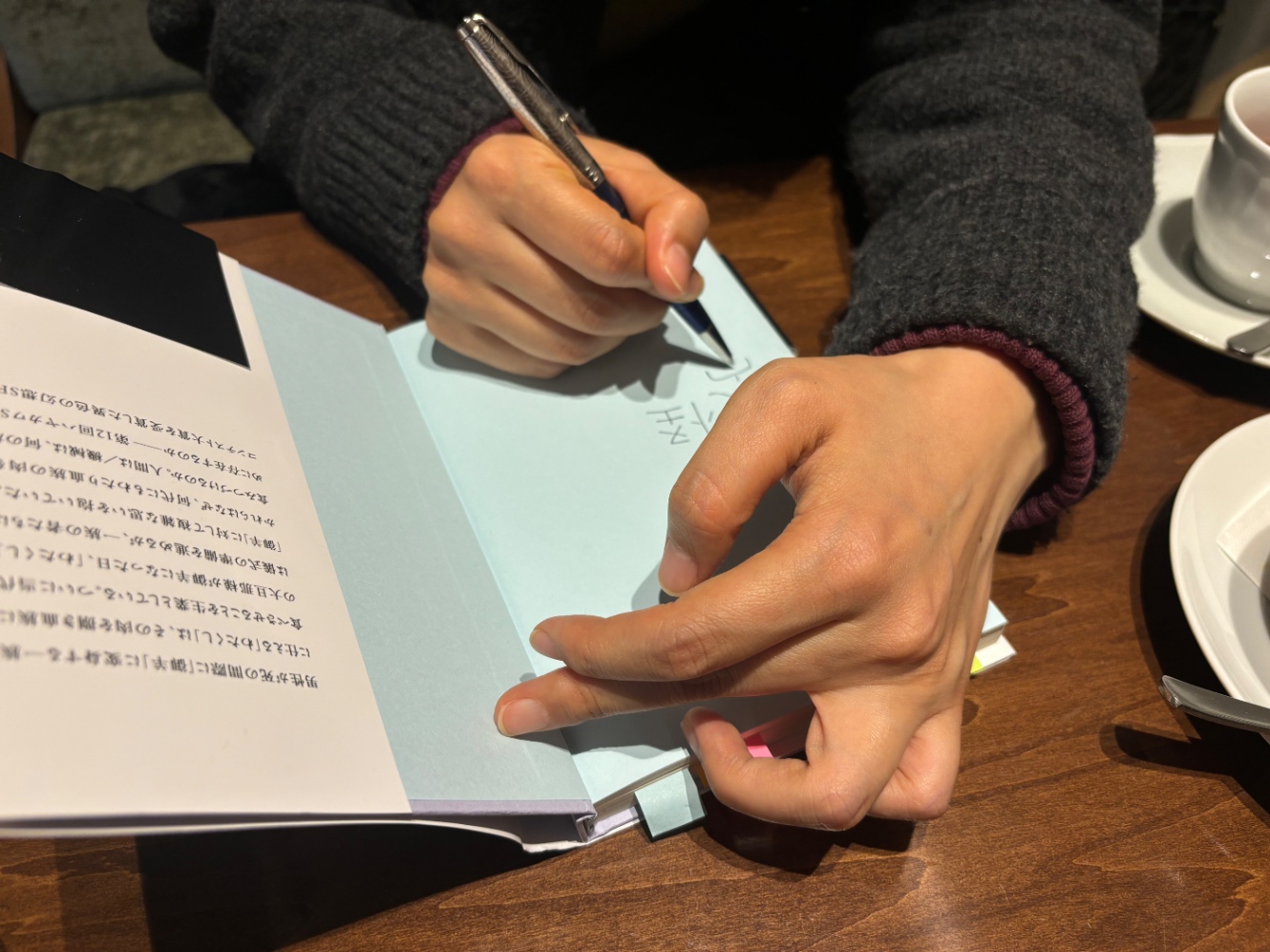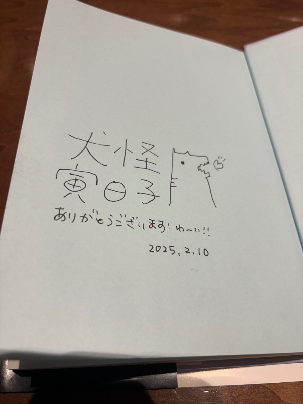 見計らって、持参した犬怪さんの単行本『羊式型人間模擬機』をテーブルの上へ。おれは おれが所持している中で最も高価で特別なボールペンを取り出してサインをお願いする。(事前に「ください」という予告はしていた)