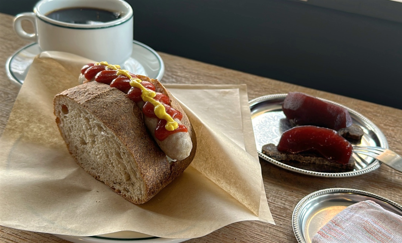 ホテルの近くの 問 tou というカフェでお昼。昨年も食べたコーヒーとホットドッグとシュトレンのセットがあったのでそれを頼む。