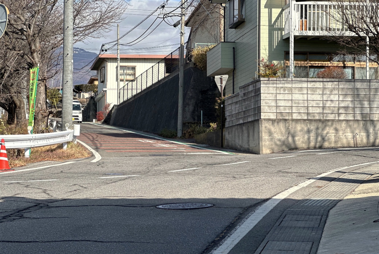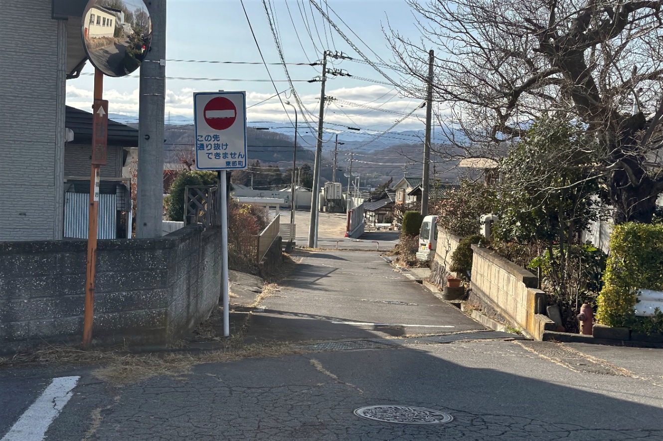 車が来てるほうから歩いてきて、右に行くと山浦真雄宅跡に行く道。