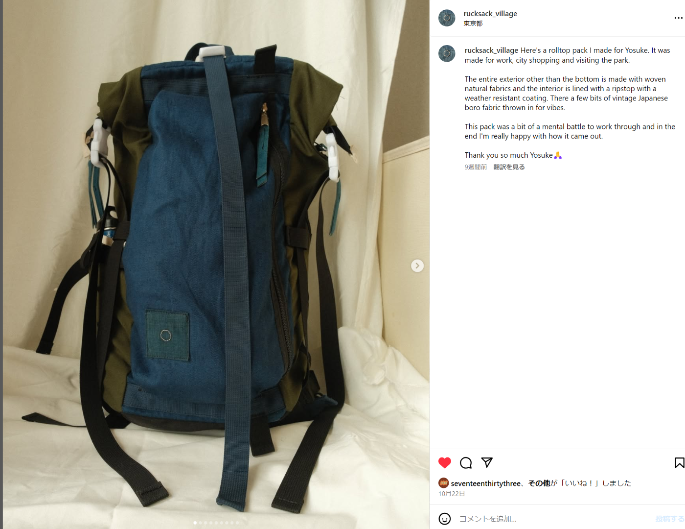 具体的にいつの頃だったかは覚えていないが、数年前にイラストレーターのIZUMIDA LEEがInstagramで紹介していたのがRucksack Villageというアカウントだった。