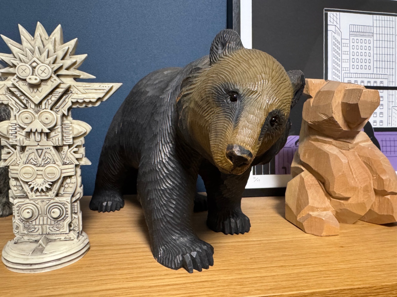 その後、佐藤憲治さんの熊もお迎えし、3匹並べて仕事机の後ろの本棚の上に飾っております。