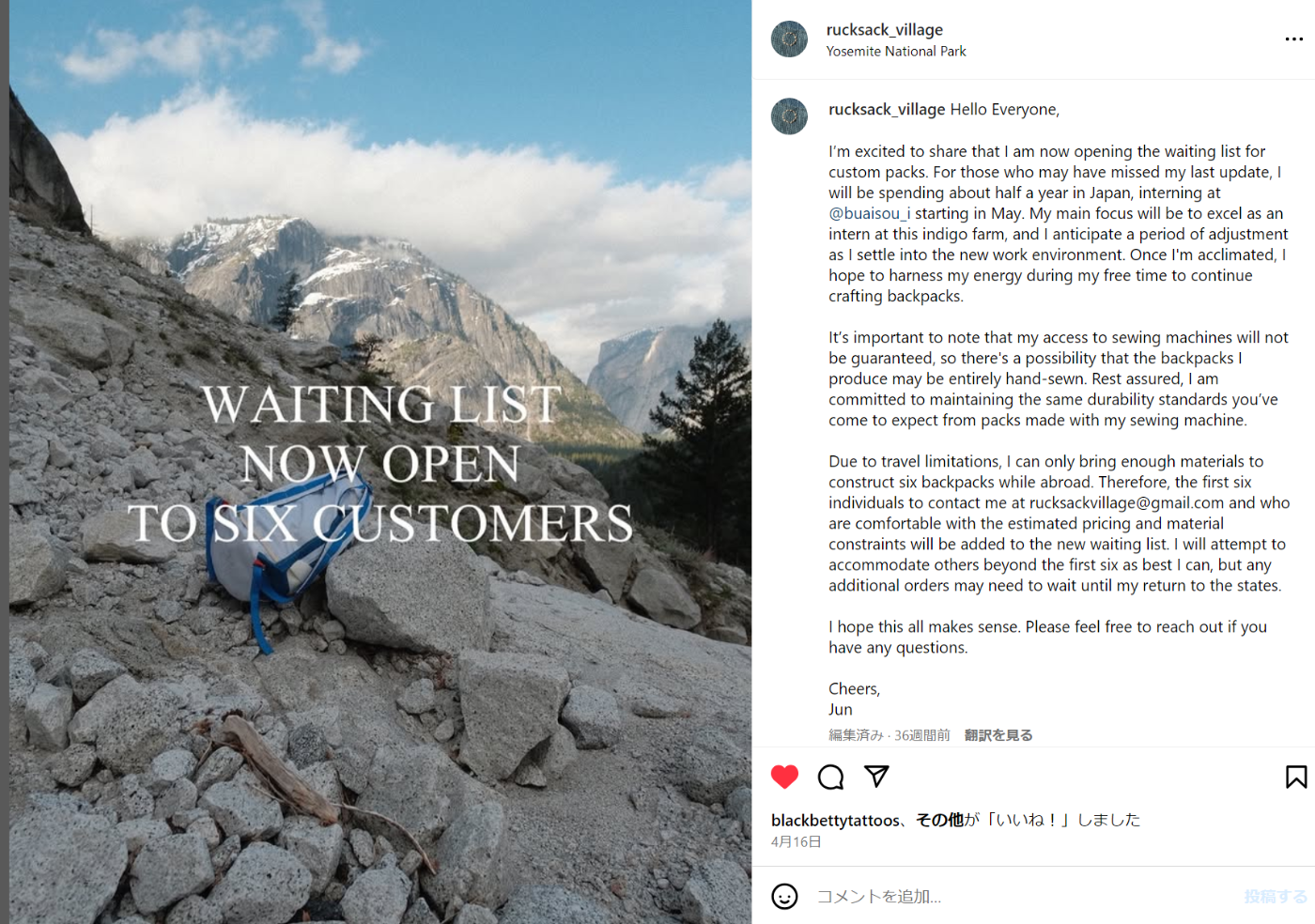 ときどき「これは◯◯のためのリュック」という投稿があり、オーダー制っぽい雰囲気を感じるが、受け付ける窓口みたいなものはなかった。