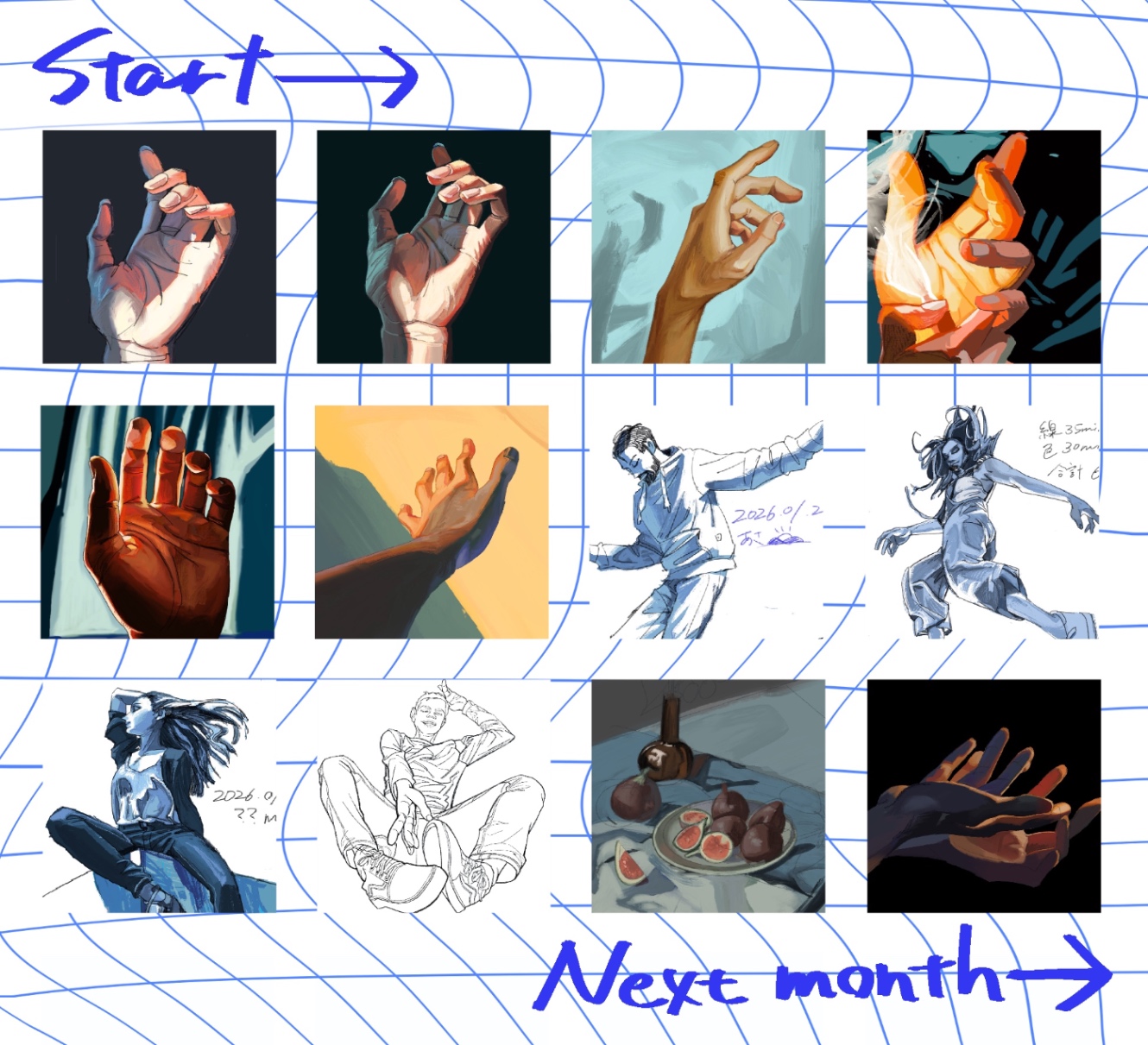 突然お絵描き♾️編に突入。色を目で見て再現することや、イラストでも光の影響を受けた色を置くのに苦手意識があったので、主に手で色の練習をしていました。Procreateの新ブラシにもようやく手を出して、筆致が残るアナログ感のある表現、自分の絵に合うぼかしなどを意識していました。おかげでだいぶいい感じのブラシセットができてきました。右下の2枚は自サーバーで行っているインターネット美術部で描いたものです。他の自主練は時間制限を設けていないのに対し、この2枚は1時間以内に描かなければいけなくて無事惨敗。リベンジするぞ!