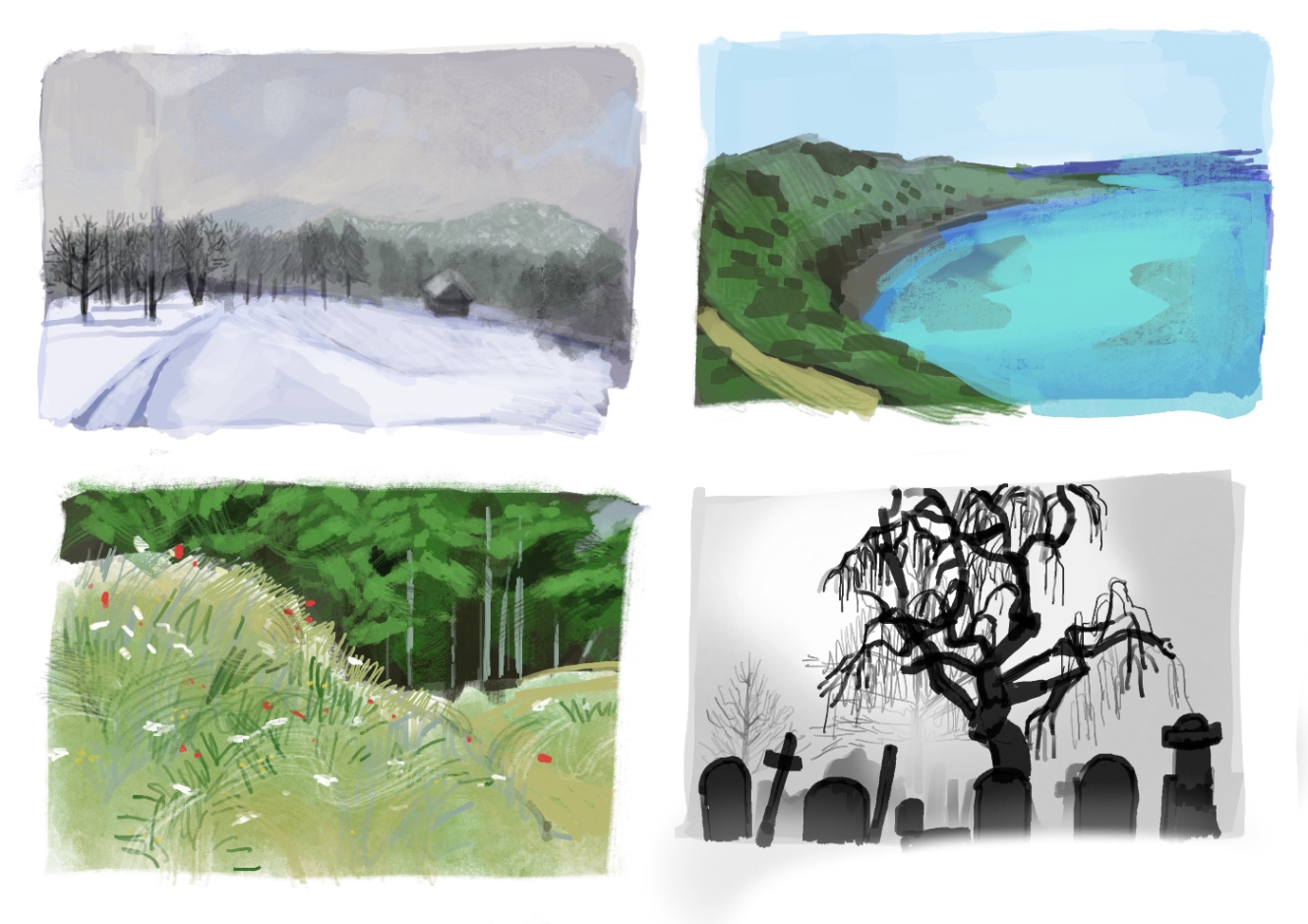 風景画を小さく描いて色の雰囲気を素早く掴む練習。左上の雪景色とかはけっこう気に入っています。