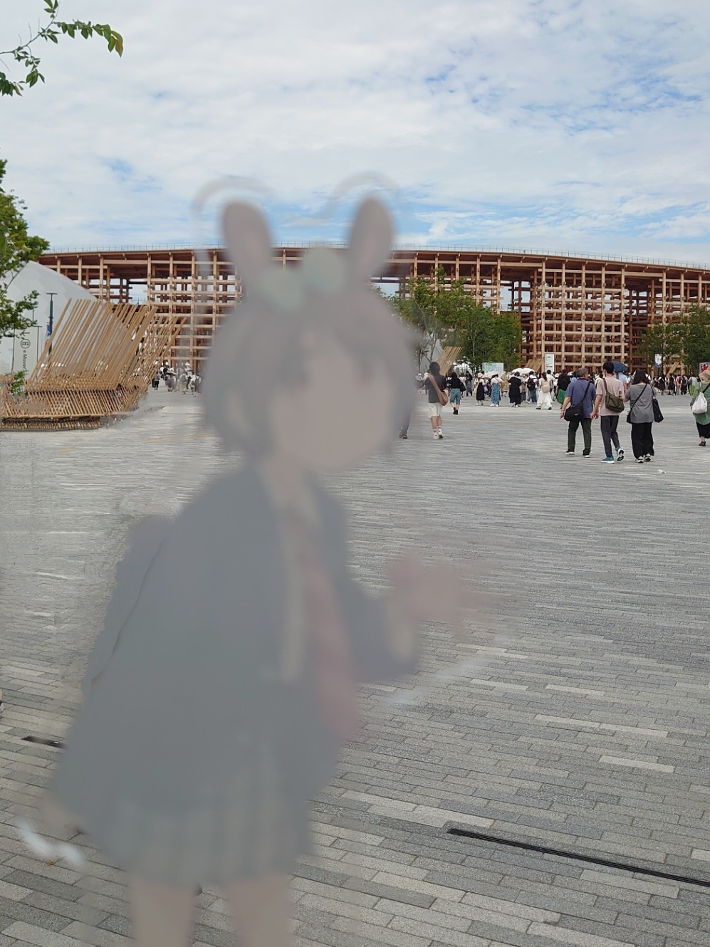 上記の写真は万博会場に入った直後、大屋根リングの外側で撮りました。今ってもう大屋根リングの解体やってるんですよね。よかったねぇ大屋根リング、ふみちゃんに会えて……。