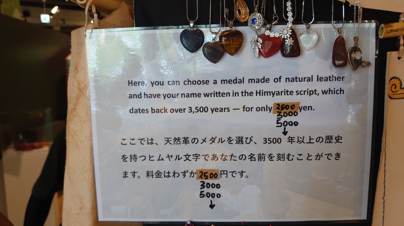 ヒムヤル文字は「南アラビア文字」とも呼ばれる、紀元前2千年紀から紀元後6世紀にかけて、現在のイエメンに相当する地域で使用されていた文字です。「ヒムヤル文字」という名は、紀元前115年頃から525年にかけてイエメン地域に存在し、この文字が使われていたヒムヤル王国から。イエメンパビリオンが提供する、名前を書いてくれるサービスとしては本来こっちがメインです。