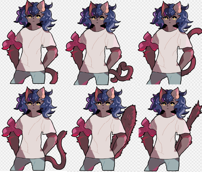あまり表情パーツの組み合わせが膨大になるのもよくないのかもと思い少し前のフリーシェル作品から目と口はセットにするようにしてみています。尻尾も表情とセットで組み合わせしました。公開版の組み合わせが自分の正解だという感じでもないので、もし使われる方がいたら好きにいじってほしいと思います(どのフリーシェルにも言えます)