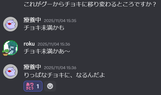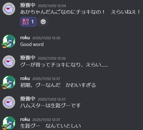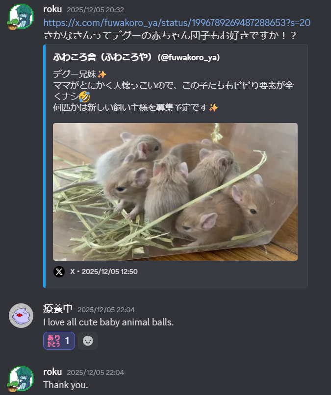 良すぎるのでTwitterで見たらブクマしたり、途中からはもうDiscordのDMで直接てちちでぱややなどうぶつの画像を送って素朴な返信を頂く、という形になっていました。