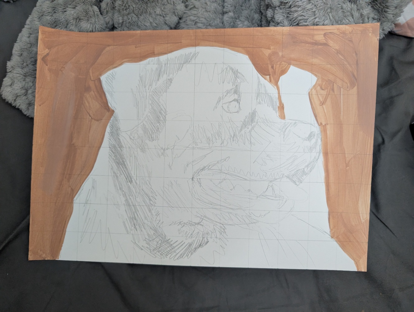プロセスでまずグリッドを引き、下描きをし、これまではグリッドや下描きを見えないように絵の具で潰していたが、あえてグリッドを残す